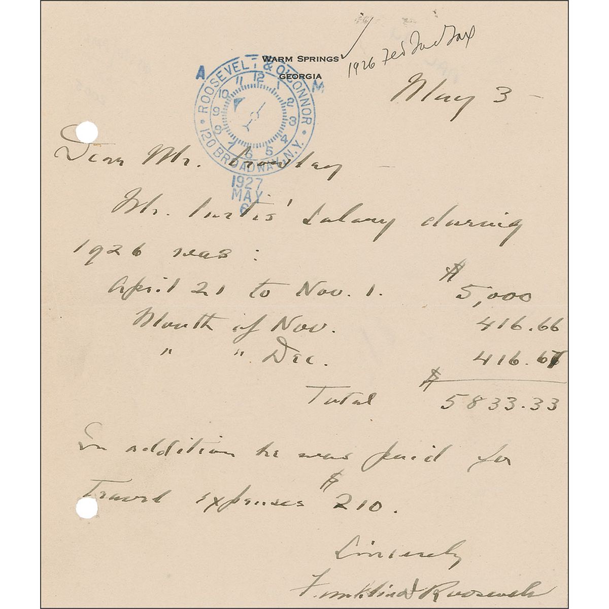 ALS, one page, 6 x 6.75 (possibly trimmed), Warm Springs letterhead, May 3 [1927]. Roosevelt writes to Mr. Crowley. In part: “Mr. Curtis’ salary during 1926 was …$5,833.33. In addition he was paid for travel expenses $210.” Secretarial ink stamp and file holes touching a few words of text, notation to top, otherwise fine condition.