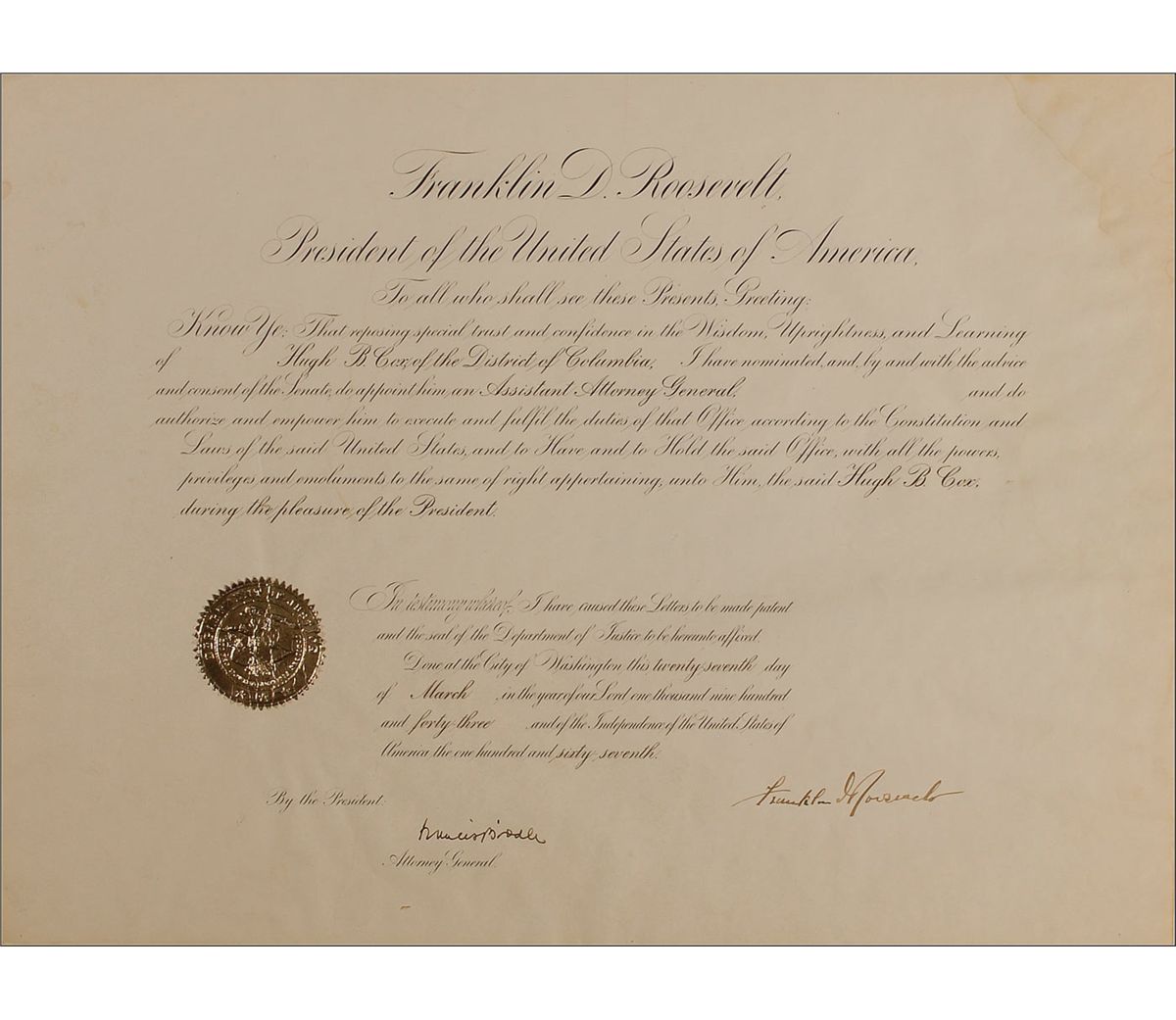 Partly-printed, war-dated DS as president, one page, 19.75 x 14.75, March 27, 1943. President Roosevelt appoints Hugh B. Cox to be “Assistant Attorney General.” Signed at the conclusion by Roosevelt and countersigned by Attorney General Francis Biddle. In very good condition, with mild overall rippling and wrinkling from moisture exposure, damp staining along right side, and a bit of scattered light soiling. The gold foil seal is lightly creased, but intact.