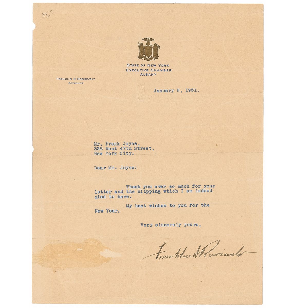 TLS, one page, 8 x 10.5, State of New York Executive Chamber, Albany gold-embossed letterhead, January 8, 1931. Governor Roosevelt writes to Frank Joyce, in full: “Thank you ever so much for your letter and the clipping which I am indeed glad to have. My best wishes to you for the New Year.” In good condition, with several intersecting folds, light creasing, uniform toning, two half-binder holes to the left edge, a faint pencil notation to the top left corner, and adhesive remnants with a small area of paper loss towards the bottom left corner.