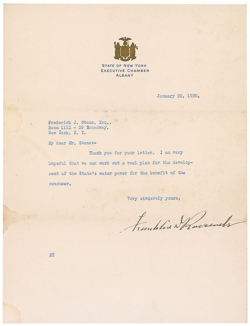 TLS, one page, 8 x 10.5, State of New York, Executive Chamber letterhead, January 20, 1930. Short letter to New York attorney Frederick J. Stone. In full: “Thank you for your letter. I am very hopeful that we can work out a real plan for the development of the State's water power for the benefit of the consumer.” In very good condition, with scattered light dampstaining and foxing, and horizontal fold through tops of a few letters of signature.