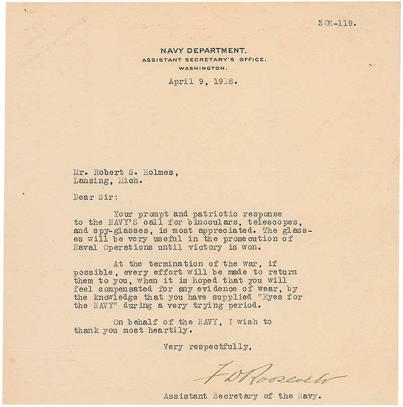 TLS signed “F. D. Roosevelt,” one page, 8 x 8, Navy Department letterhead, April 9, 1918. In a letter to an enthusiastic Navy supporter, Roosevelt writes as Assistant Secretary of the Navy, in part: “Your prompt and patriotic response to the NAVY’s call for binoculars, telescopes, and spy-glasses, is most appreciated. The glasses will be very useful in the prosecution of Naval Operations until victory is won. At the termination of the war, if possible, every effort will be made to return them to you, when it is hoped that you will feel compensated for any evidence of wear, by the knowledge that you have supplied ‘Eyes for the NAVY’ during a very trying period.” Trimmed bottom edge, a uniform shade of toning, and light pencil remnants to top left, otherwise fine condition.