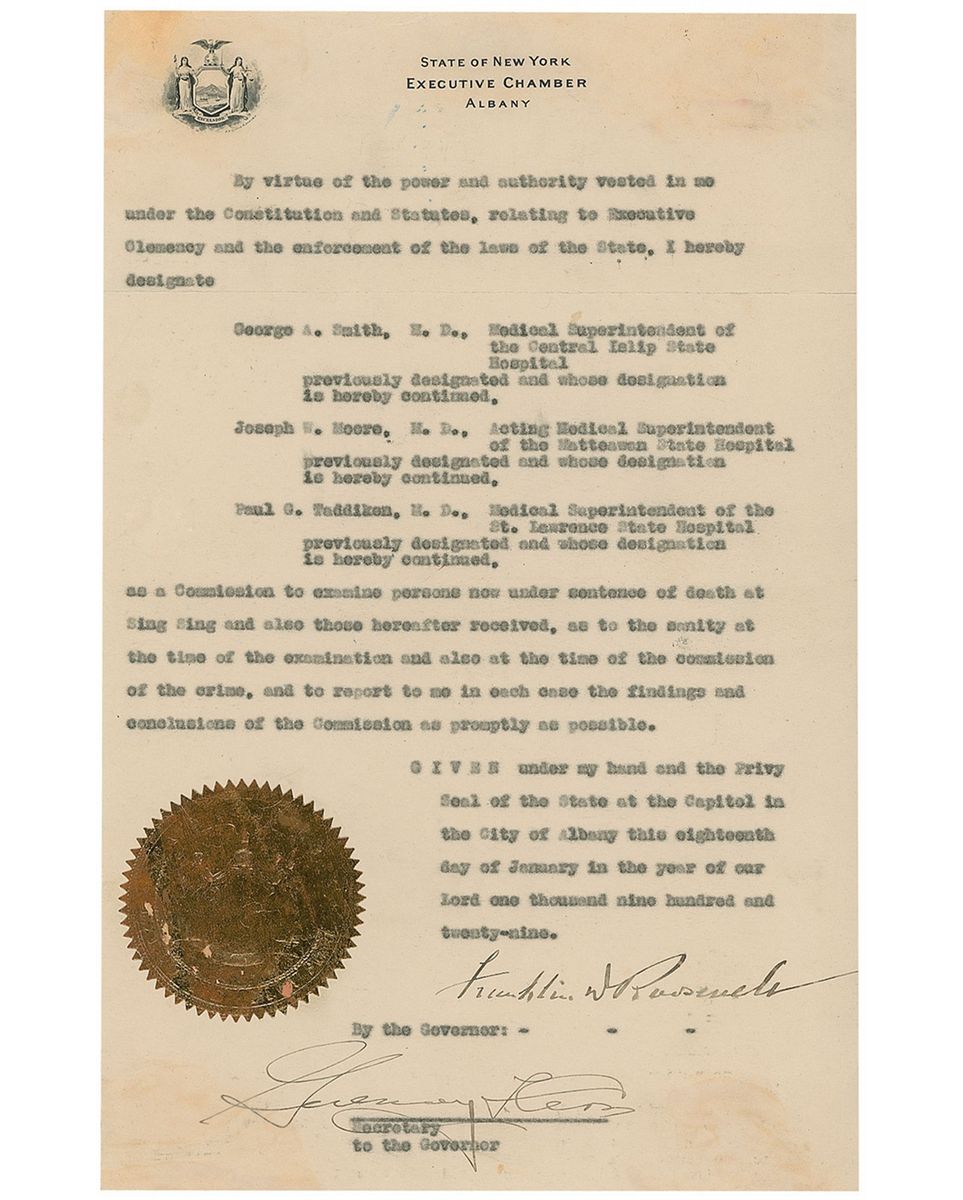 DS as Governor of New York, one page, trimmed in size to 7.75 x 12, January 18, 1929. A document appointing three individuals to “a Commission to examine persons now under sentence of death at Sing Sing…as to the sanity at the time of the examination and also at the time of the commission of the crime.” In very good condition, with trimming as noted, and light scattered soiling, staining, and wrinkling. The gold foil seal is worn, but intact.