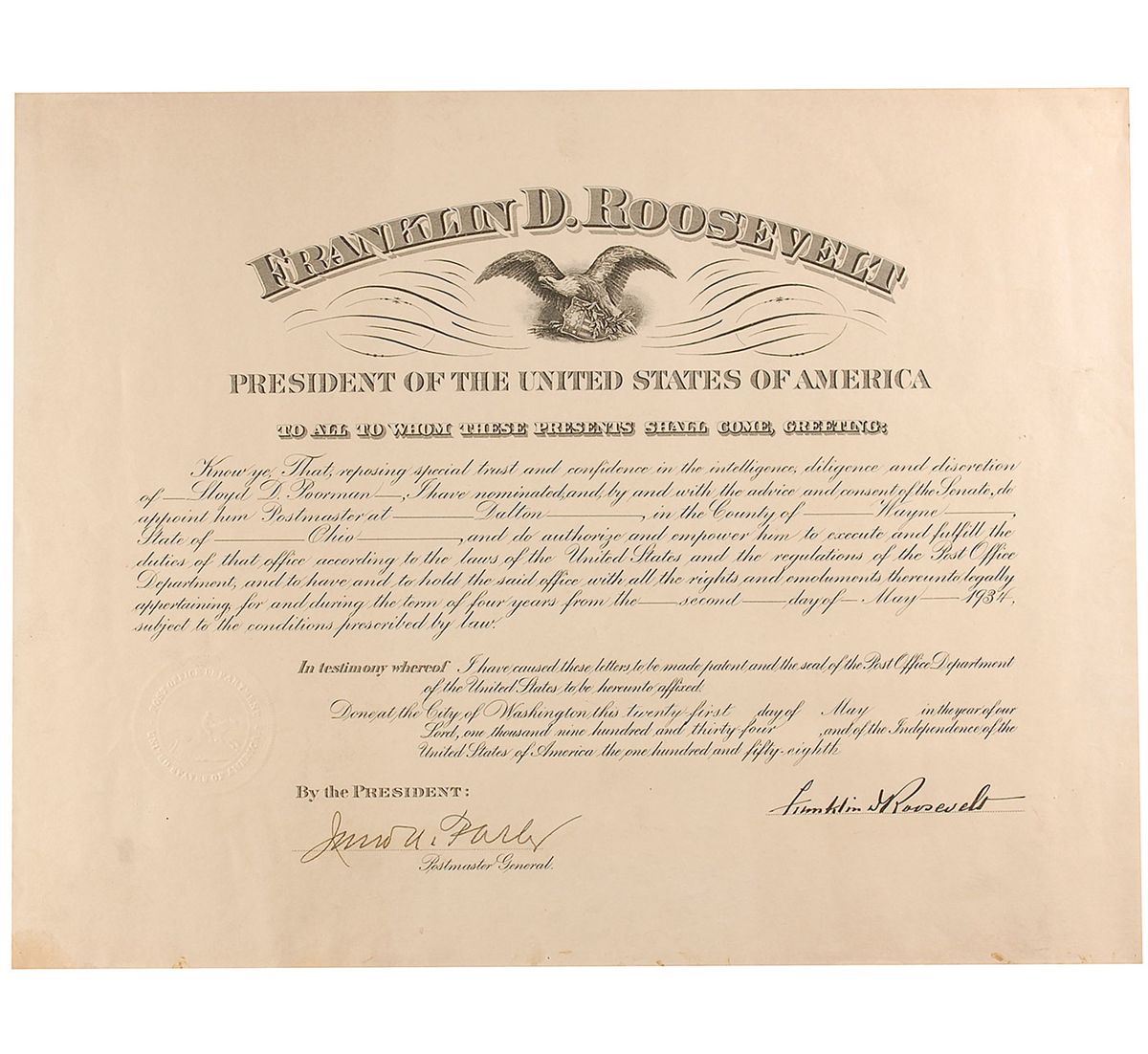 Partly-printed DS as president, one page, 18 x 14, May 21, 1934. President Roosevelt appoints Lloyd D. Poorman Postmaster of Dalton, Ohio. Boldly signed at the conclusion by Roosevelt and countersigned by Postmaster General James A. Farley. In very good to fine condition, with scattered toning and soiling, and some light dampstaining along bottom.