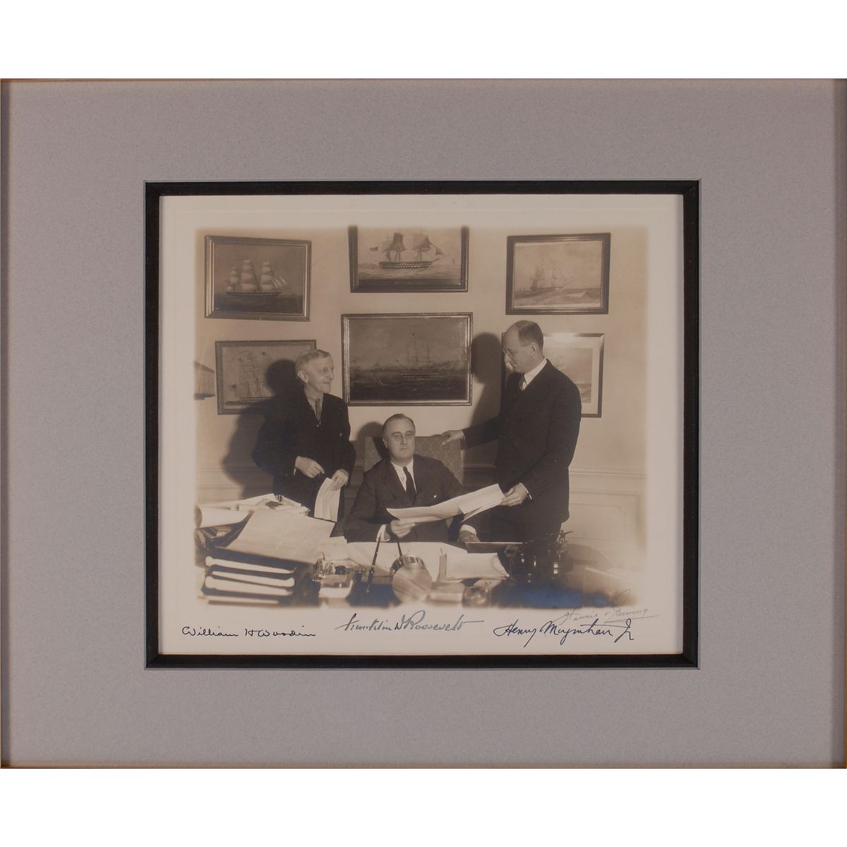 Superb vintage matte-finish 10 x 9 Harris and Ewing photo of President Roosevelt seated at his desk with his first and second Secretaries of the Treasury, William Woodin and Henry Morgenthau on either side, signed in the lower border in fountain pen by Roosevelt, Woodin, and Morgenthau. Photo also bears a photographer’s pencil notation to lower right. Nicely double matted and framed to an overall size of 20.5 x 17.75. In fine condition, with a bit of scattered light silvering, primarily to bottom of image. Accompanied by a 1933 TLS from Henry Woodin forwarding the photo. An exceptional portrait of the three men who nurtured the American economy back to stability.