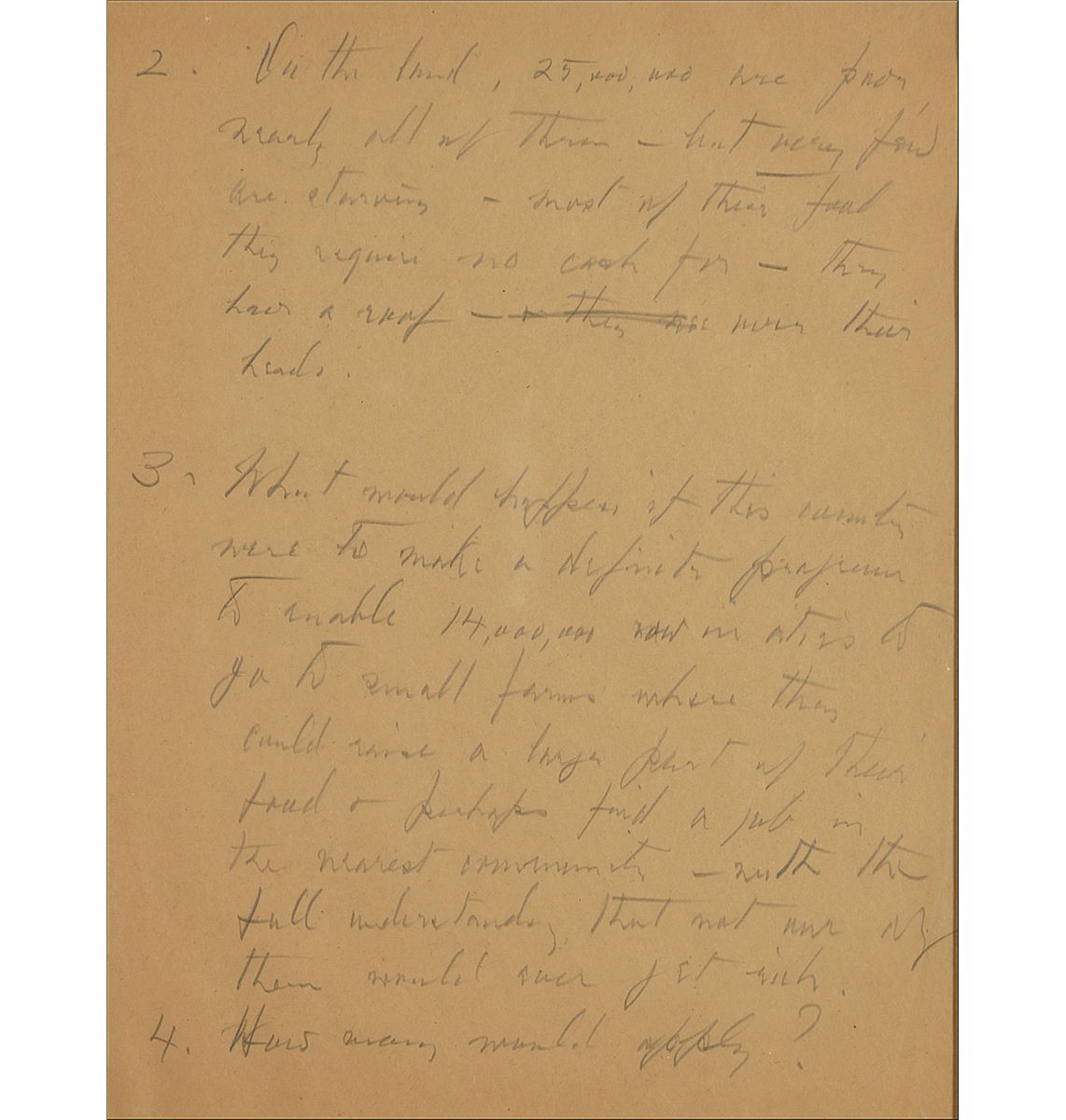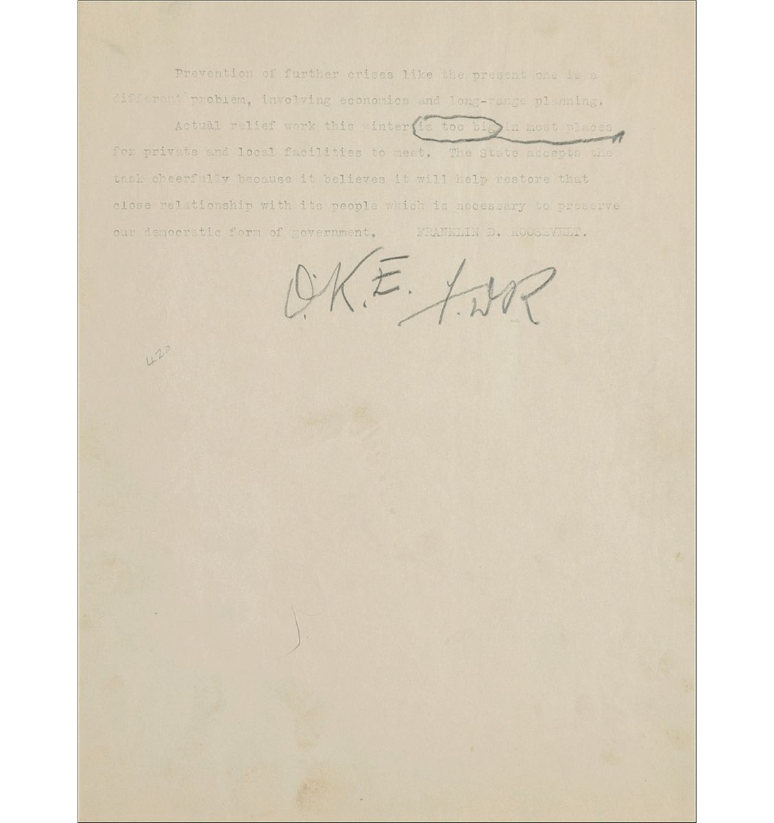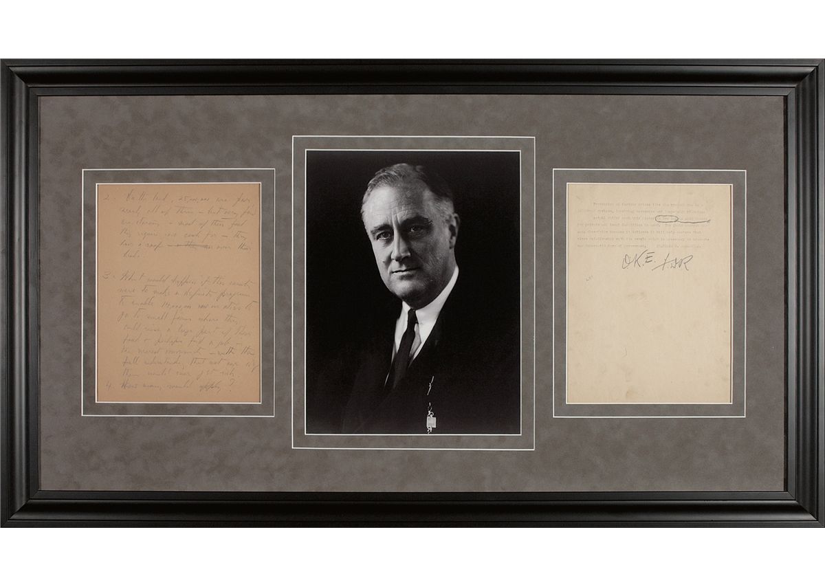 Typed and handwritten notes for a speech given by Roosevelt, comprising one unsigned 8.5 x 11 sheet written in pencil by FDR, and a typed 8.5 x 11 page signed in pencil, “O.K.E., F.D.R.,” no date [circa 1931]. The handwritten sheet reads, in full: “2. On the land, 25,000,000 are poor, nearly all of them—but very few are starving—most of their food they require no cash for—they have a roof [crossouts] over their heads. 3. What would happen if this country were to make a definite program to enable 14,000,000 now in cities to go to small farms where they could raise a large part of their food & perhaps find a job in the nearest community—with the full understanding that not one of them would ever get rich. 4. How many would apply?” The typewritten sheet reads, in full: “Prevention of further crises like the present one is a different problem, involving the economics and long-range planning. Actual relief work this winter [circled in pencil: is too big] in most places for private and local facilities to meet. The State accepts the task cheerfully because it believes it will help restore that close relationship with its people which is necessary to preserve our democratic form of government.” Roosevelt’s language, particularly that on the typewritten sheet, echoes that he used in describing the aims of the Temporary Emergency Relief Administration (TERA), one of his most important initiatives as Governor of Depression-era New York. This pioneering program of state-administered government assistance, established in October 1931, was the first of its kind in the country. Its success not only helped push FDR to the forefront of Democratic nominees for president in the following year, but also provided an important model for the New Deal programs—including Social Security, the Works Progress Administration, and others—that he would soon enact as America’s first four-term Commander-in-Chief. Both pages are handsomely matted and framed with a photo to an overall size of 40.25 x 22.75. In good to very good condition, with allover toning to handwritten sheet, scattered soiling to typewritten sheet, and chips, small edge tears, and small pieces of mounting tape to reverse of both sheets. The text is clear and generally unaffected throughout. A most important and historic document from the man who, more than any other individual, marshalled the resources to rescue America from the most dire economic state it had ever known! Oversized.
