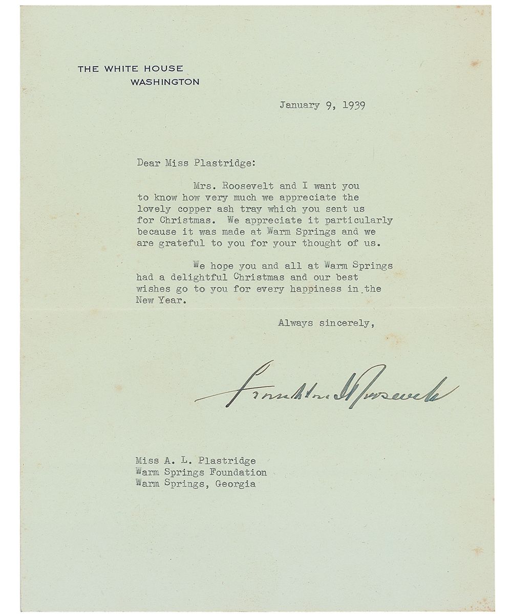 TLS as president, one page, 7 x 9, White House letterhead, January 9, 1939. A letter of thanks to Alice Lou Plastridge, FDR’s physical therapist at Warm Springs. In full: “Mrs. Roosevelt and I want you to know how very much we appreciate the lovely copper ash tray which you sent us for Christmas. We appreciate it particularly because it was made at Warm Springs and we are grateful to you for your thought of us. We hope you and all at Warm Springs had a delightful Christmas and our best wishes go to you for every happiness in the New Year.” Scattered foxing and toning, and creases to the left side and lower right corner, otherwise fine condition.