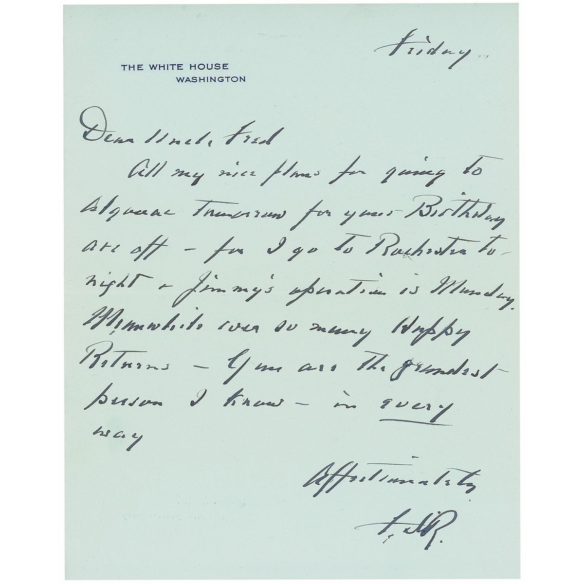 Rare ALS as president signed “F. D. R.,” one page, 7 x 9, White House letterhead, no date [circa September, 1938]. Letter to Frederic Delano, his mother’s brother, addressed as “Dear Uncle Fred.” In full: “All my nice plans for going to Algonac tomorrow for your Birthday are off—for I go to Rochester to night & Jimmy’s operation is Monday. Meanwhile ever so many Happy Returns—You are the grandest person I know—in every way.” Accompanied by the original White House transmittal letter addressed by Roosevelt to “Hon. F. A. Delano.” In fine condition.