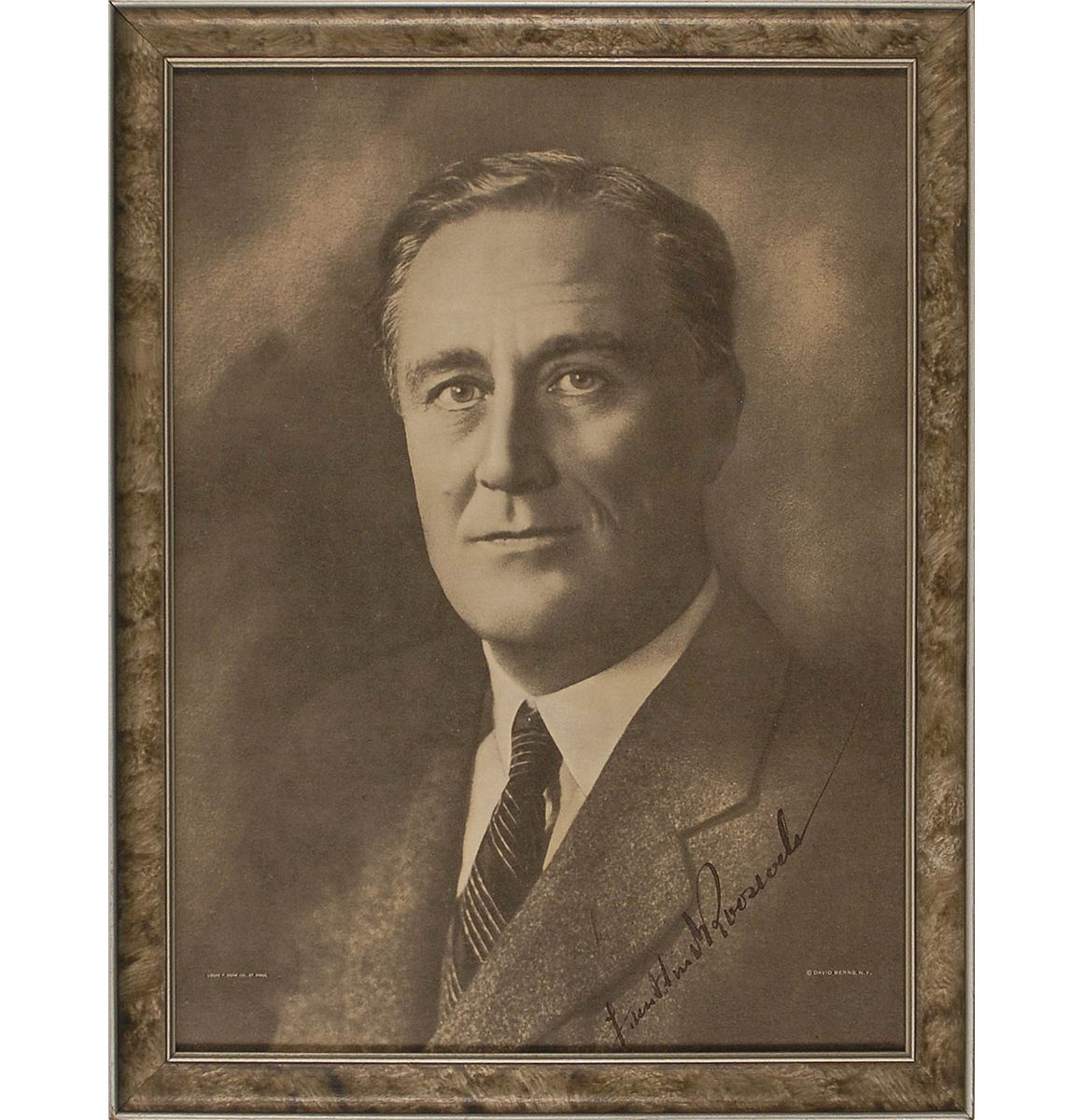 Vintage print, 8 x 10.75, of an artist’s rendition of Roosevelt, signed in fountain pen by Roosevelt. Framed to an overall size of 9.25 x 12. In fine condition.