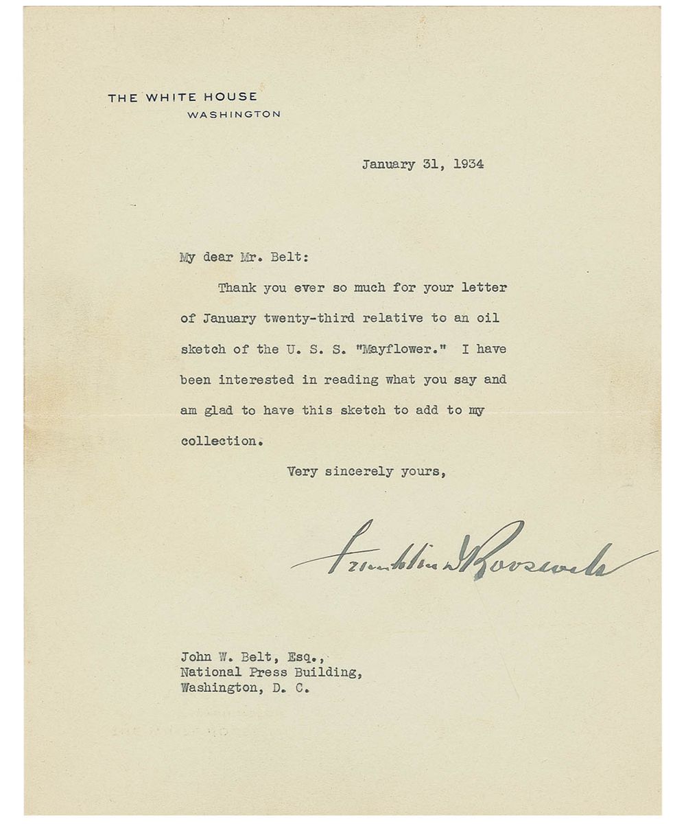 TLS as president, one page, 7 x 9, White House letterhead, January 31, 1934. Letter to John Belt at the National Press Building. In part: “Thank you ever so much for your letter…relative to an oil sketch of the U. S. S. ‘Mayflower.’ I have been interested in reading what you say and am glad to have this sketch to add to my collection.” In fine condition, with a bit of scattered light toning and foxing.