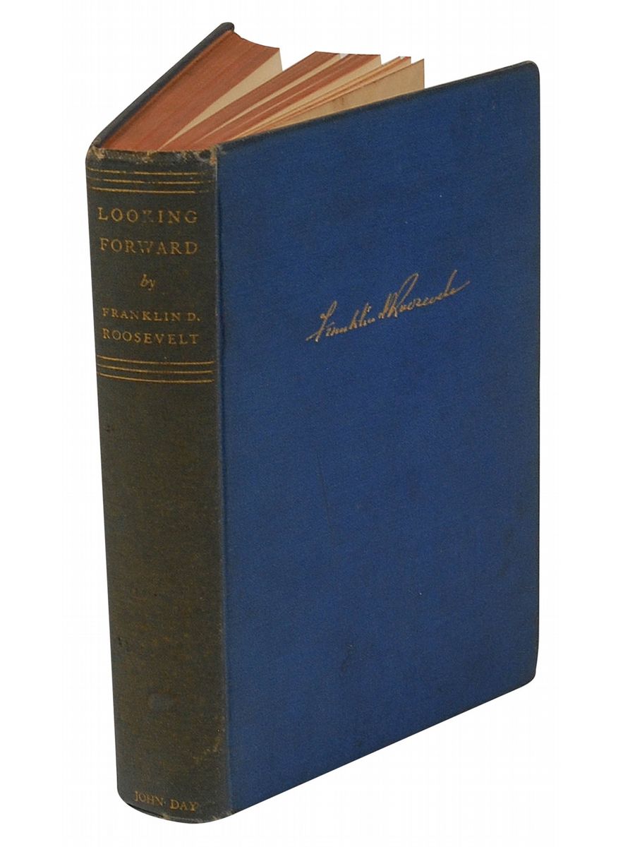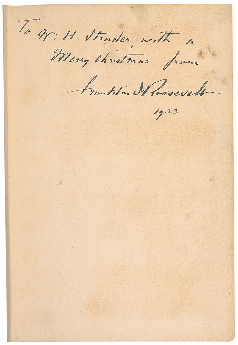 Signed book: Looking Forward. First edition, later printing. NY: John Day Company, 1933. Hardcover, 5.5 x 7.75, 279 pages. Signed and inscribed on the first free end page, as president, “To W. H. Strudes, with a Merry Christmas from Franklin D. Roosevelt 1933.” In very good condition, with scattered toning and soiling to signed page. This presidential Christmas gift was presented personally (with a handshake from FDR) to roughly 100-150 members of his Executive White House staff at his first Christmas White House party in December 1933. Includes a small gold leaf with “From President’s Birthday Cake, Jan. 30/34” written on backside. Book description: G+/None. Blue cloth-covered boards with gilt lettering; moderate edgewear; spine sunned; approx. 4 inch crack in front hinge (binding still strong); one interior hinge partially cracked; light foxing to exterior and feps; rfep cut out.