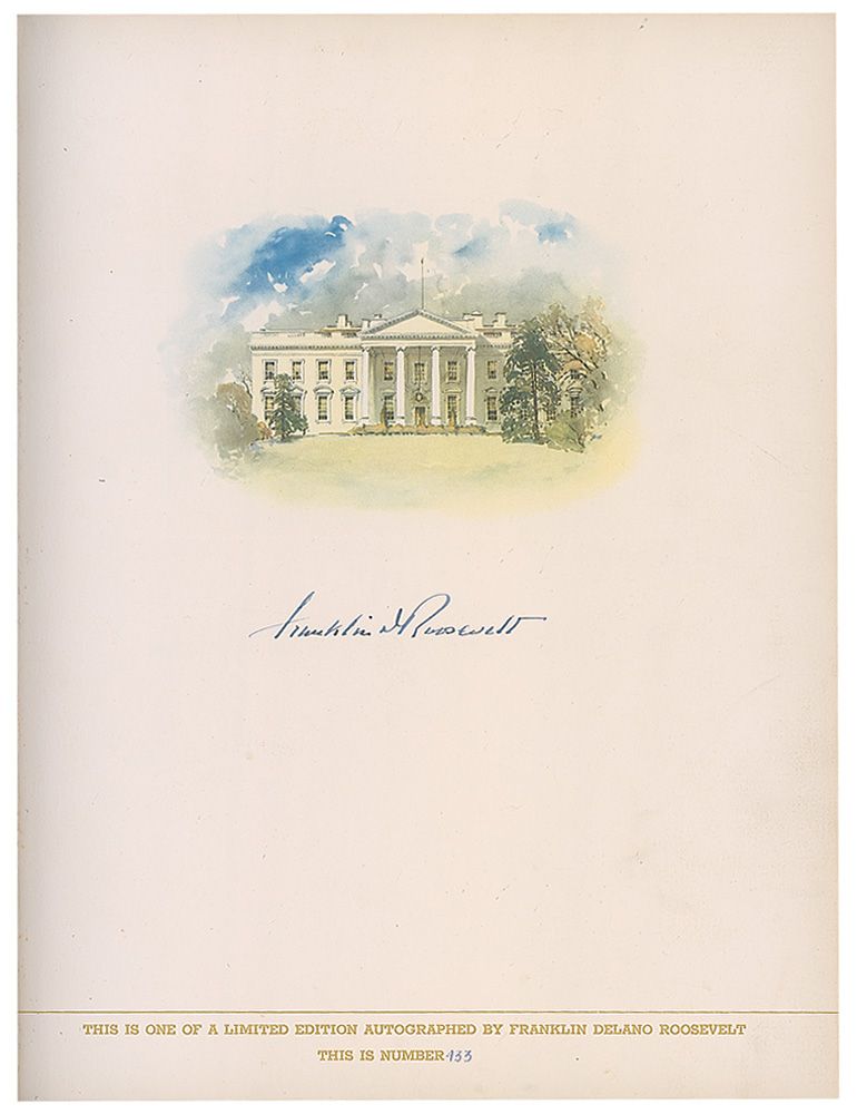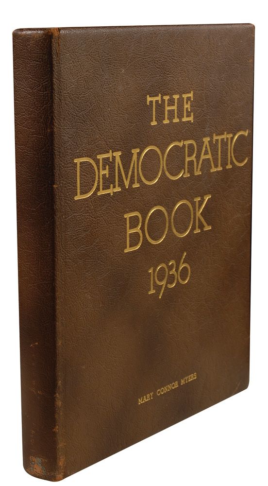Signed book: The Democratic Book: 1936. Gilt-stamped leather (including “Mary Connor Myers,” the original owner), 11.5 x 14.5, 384 pages. Limited edition (limitation unspecified; this copy is No. 433), signed by Roosevelt on the limitation page beneath a watercolor vignette of the White House. In fine condition, with some scuffs to the covers, scattered soiling, and a bottom portion of one of FDR’s portraits on an inside page torn out. The signed watercolor remains unaffected. A lavishly produced promotional ‘year book’ for the Democratic Party, the publication of The Democratic Book in the Spring of 1936 was assailed by Republicans as a violation of the Corrupt Practices Act which prohibits corporations from contributing to national campaigns.