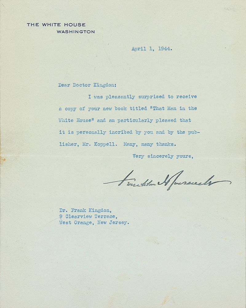 TLS as president, one page, 7 x 8.75, White House letterhead, April 1, 1944. Letter to Frank Kingdon. In full: “I was pleasantly surprised to receive a copy of your new book titled ‘The Man in the White House’ and am particularly pleased that it is personally inscribed by you and the publisher, Mr. Koppell. Many, many thanks.” In fine condition, with scattered toning.