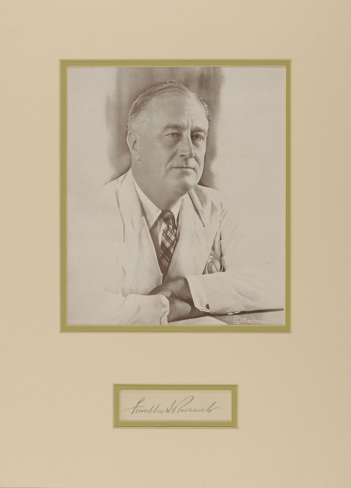 Vintage fountain pen signature, “Franklin D. Roosevelt,” on an off-white 4 x 1 slip. Double matted with an unsigned portrait of Roosevelt to an overall size of 13 x 18. In fine condition, with trivial show-through from stamps to reverse.