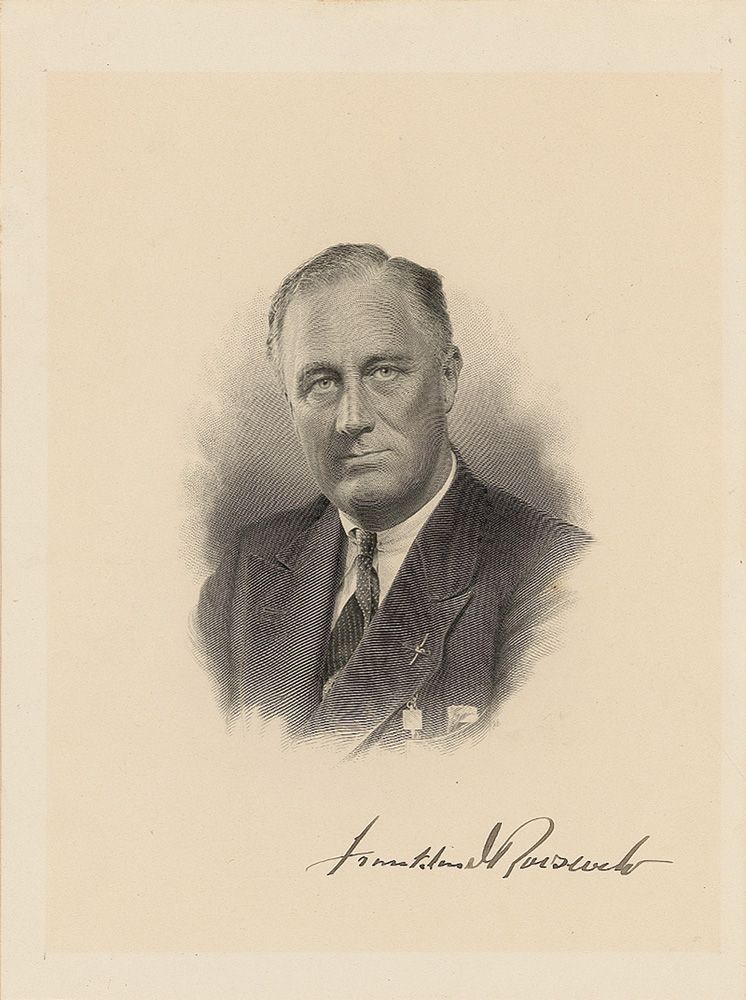 Exquisite vintage engraved portrait, 7.25 x 9.75, signed below the image in fountain pen, “Franklin D. Roosevelt.” In fine condition, with mild toning from previous display.