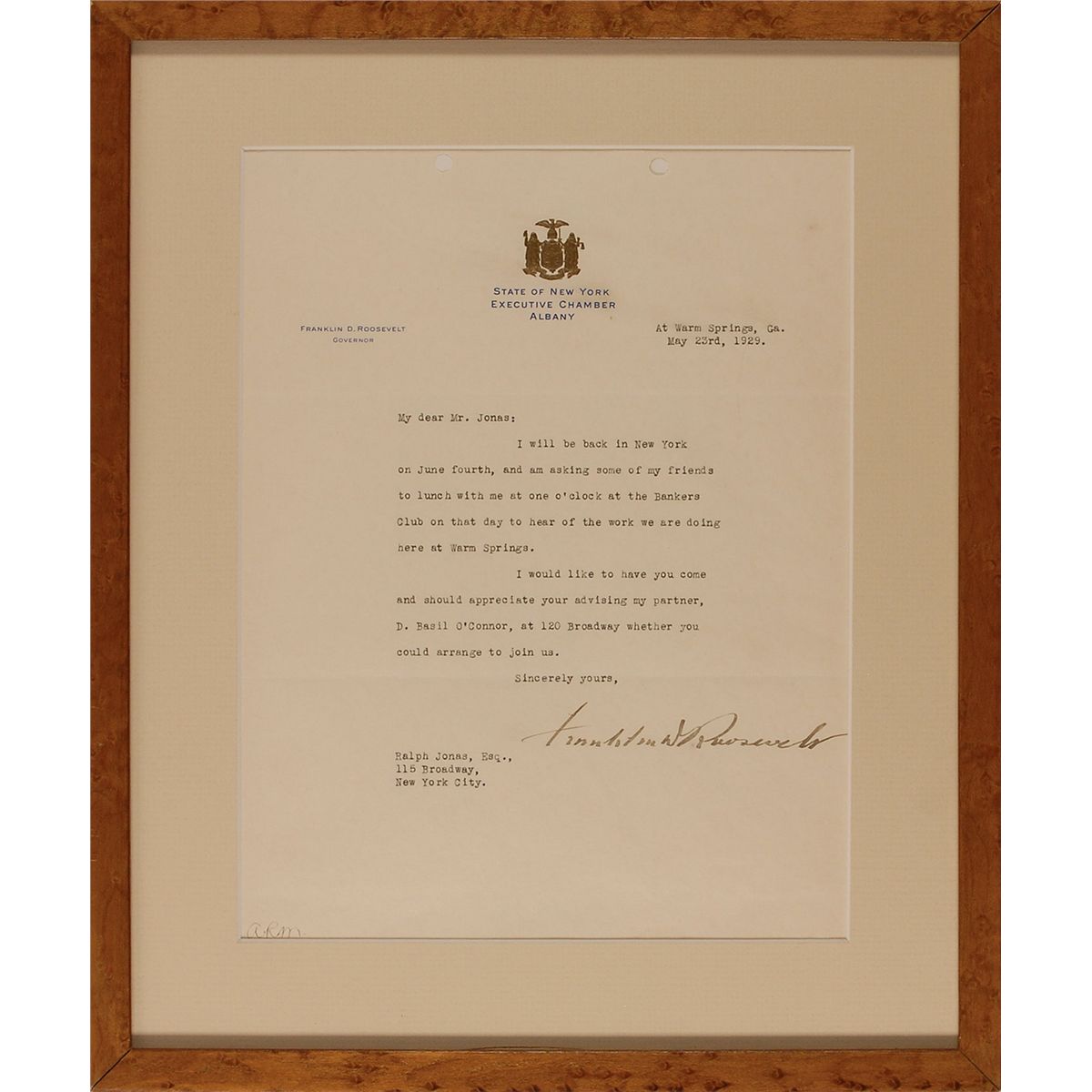 TLS, one page, 7.75 x 10.25, State of New York letterhead, May 23, 1929. From Warm Springs, Roosevelt writes to Ralph Jonas. In part: “I will be back in New York on June fourth, and am asking some of my friends to lunch with me at one o’clock at the Bankers Club on that day to hear of the work we are doing here at Warm Springs.” Matted and framed to an overall size of 11.5 x 15. In fine condition, with two punch holes to top and a small ink notation to bottom. This letter is written by Franklin Roosevelt on State of New York letterhead as sitting governor of the state of New York. A year later, in 1930, Roosevelt would run again on his ‘progressive ticket’ and would be re-elected by an overwhelming margin of fourteen percent. Two years later, in 1932, again running on his progressive beliefs, he would be elected the 32nd President of the United States.
