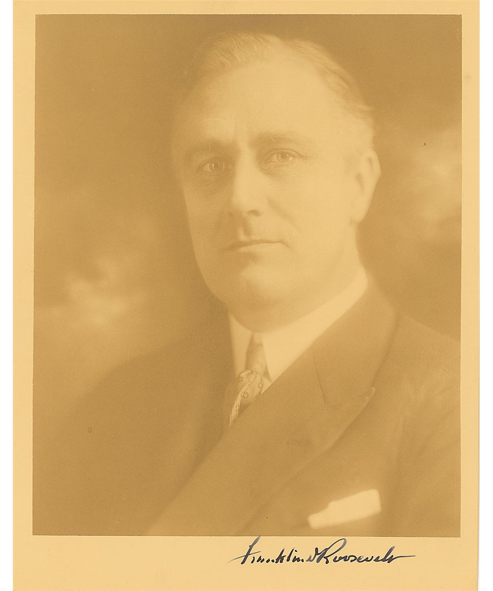 Spectacular vintage sepia matte-finish 8 x 10 photo of a younger Roosevelt, signed in the lower border in fountain pen. Light corner tip creasing and the image a bit faded, otherwise fine condition.