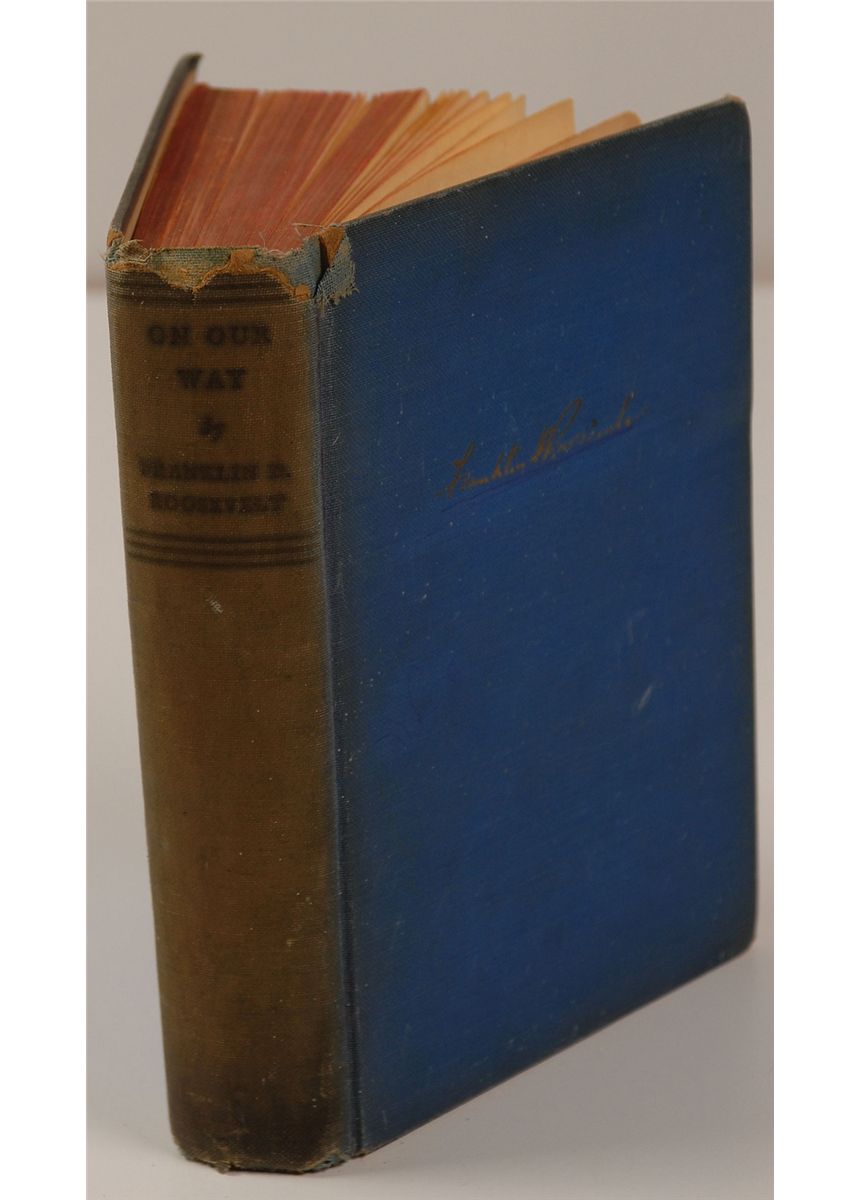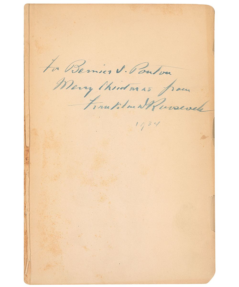 Signed book: On Our Way. First edition. NY: John Day Company, 1934. Hardcover, 5.5 x 7.75, 300 pages. Signed and inscribed, as president, on the fully-detached first free end page, “For Bernier S. Pouton, Merry Christmas from Franklin D. Roosevelt 1934.” Autographic condition: very good, with scattered light toning to page as well as several small tears and chips to edges, and two handwritten corrections to text in an unknown hand. Book condition: G+/None. Blue cloth-covered boards; edges worn, with several tears in cloth at corners and spine-ends; spine sunned; pen mark down front joint and below gilt name on front cover; moderate soiling; front and rear hinges cracked; signed ffep detached completely; textblock yellowed and lightly foxed; few pages have tiny tears at edges; previous owner has marked the title on half-title page in red pen and added her name below; name also written in same pen on rfep, with ink rubbed onto pastedown and impression visible on two previous pages. The two mistakes corrected in later printings (on pages x and 162) have been hand-corrected.