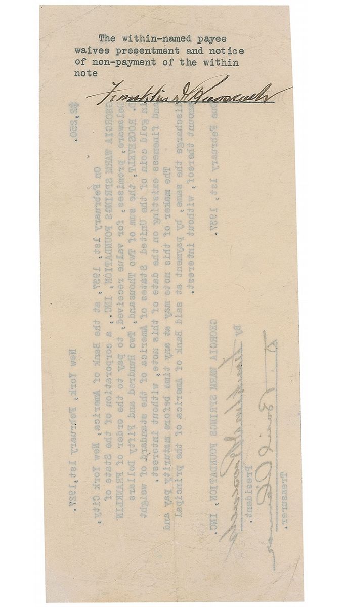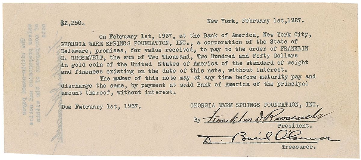 DS, one page, 8.5 x 3.75, February 1, 1927. Promissory note signed by Roosevelt as president of the Georgia Warm Springs Foundation for repayment in gold coin to himself for his personal funding of the foundation. Document reads: “On February 1st, 1937, at the Bank of America, New York City, Georgia Warm Springs Foundation, Inc., a corporation of the State of Delaware, promises, for value received, to pay to the order of Franklin D. Roosevelt, the sum of Two Thousand, Two Hundred and Fifty Dollars in gold coin of the United States of America of the standard of weight and fineness existing on the date of this note, without interest. The maker of this note may at any time before maturity pay and discharge the same, by payment at said Bank of America of the principal amount thereof, without interest.” Signed at the conclusion by Roosevelt and countersigned by his trusted advisor and onetime law partner, D. Basil O’Connor. A typed endorsement on the reverse reads, “The within-named payee waives presentment and notice of non-payment of the within note,” and is signed again by Roosevelt. In fine condition, with trimmed edges, some scattered light creases and wrinkles, staple hole above typed portion, and light show-through from endorsement and signature on reverse.