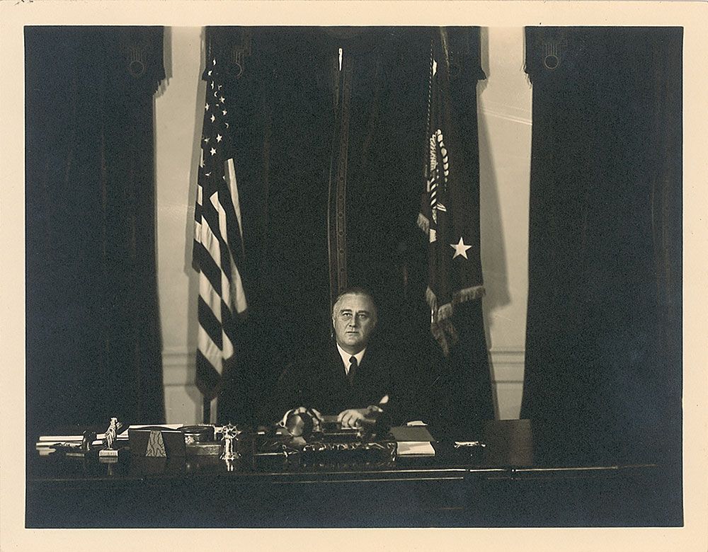 Original vintage matte-finish 10 x 8 White House portrait of Roosevelt at his desk in the Oval Office. In fine condition, with a bit of scattered light silvering.