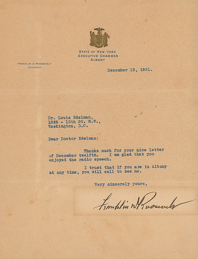 TLS, one page, 8 x 10.25, State of New York Executive Chamber letterhead, December 15, 1931. Letter to Dr. Louis Edelman of Washington. In part: “I am glad that you enjoyed the radio speech.” Removably encapsulated in a Mylar sleeve. In very good condition, with moderate overall toning, with a lighter block over the signature area from previous display.
