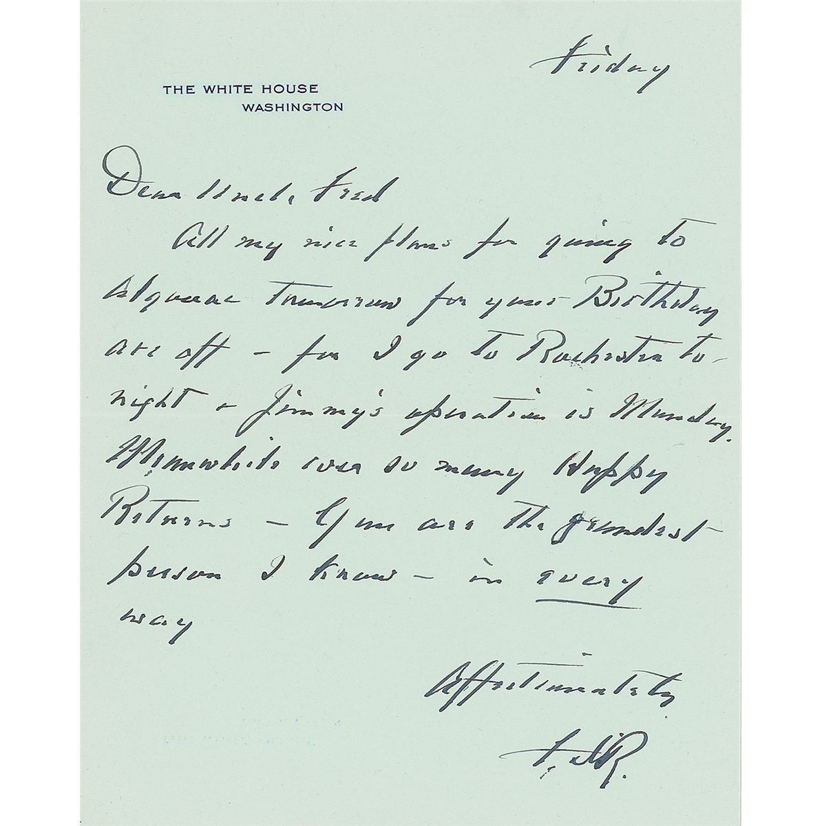Rare ALS as president signed “F. D. R.,” one page, 7 x 9, White House letterhead, no date [circa September, 1938]. Letter to Frederic Delano, his mother’s brother, addressed as “Dear Uncle Fred.” In full: “All my nice plans for going to Algonac tomorrow for your Birthday are off—for I go to Rochester to night & Jimmy’s operation is Monday. Meanwhile ever so many Happy Returns—You are the grandest person I know—in every way.” In fine condition. Accompanied by the original White House transmittal letter addressed by Roosevelt to “Hon. F. A. Delano.” As Hitler set his sights on the Sudetenland, escalating the situation abroad, the US president faced his own struggles at home. After previously unsuccessful treatments for a small gastric ulcer, Roosevelt’s son James was scheduled for emergency surgery on September 12th. Canceling plans to attend his “Dear Uncle Fred’s” 75th birthday celebration at the Delano family estate in Algonac, he offers his warmest wishes for “ever so many Happy Returns.” A kind, sincere, and decidedly rare handwritten letter from the president, setting aside his private worries and international concerns to extend love to his dear uncle.