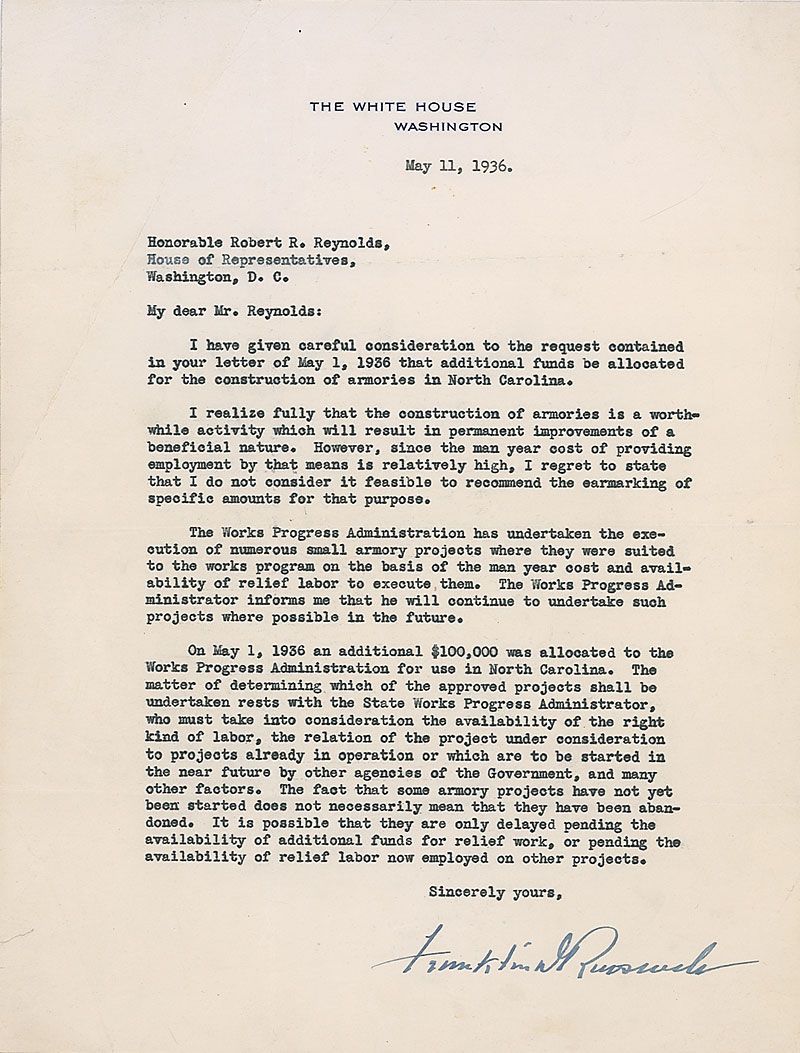 TLS as president, one page, 8 x 10.5, White House letterhead, May 11, 1936. Letter to Robert Rice Reynolds of North Carolina. In part: “The construction of armories is a worthwhile activity which will result in permanent improvements of a beneficial nature. However…I do not consider it feasible to recommend the earmarking of specific amounts for that purpose. The Works Progress Administration has undertaken the execution of numerous small armory projects where they were suited to the works program.” Intersecting folds, a crease to the upper left corner, and light overall wrinkling, otherwise fine condition. Though the recipient of this letter, Reynolds, was a fellow democrat, FDR raised funds to defeat him—this letter is a perfect example of Roosevelt rebuffing his recommendations.