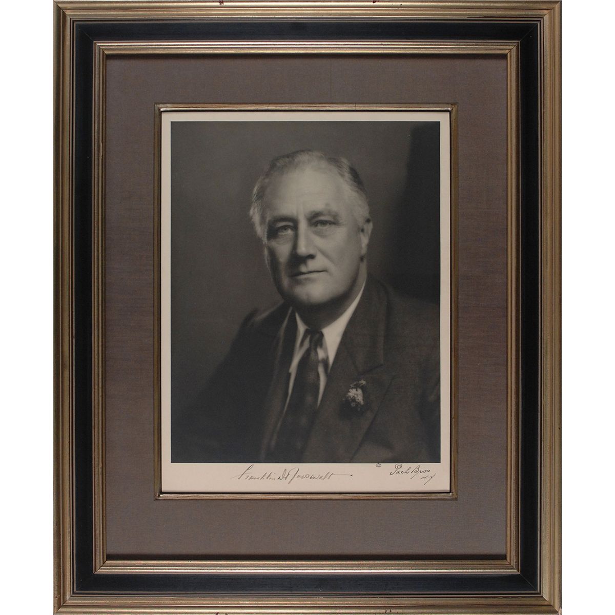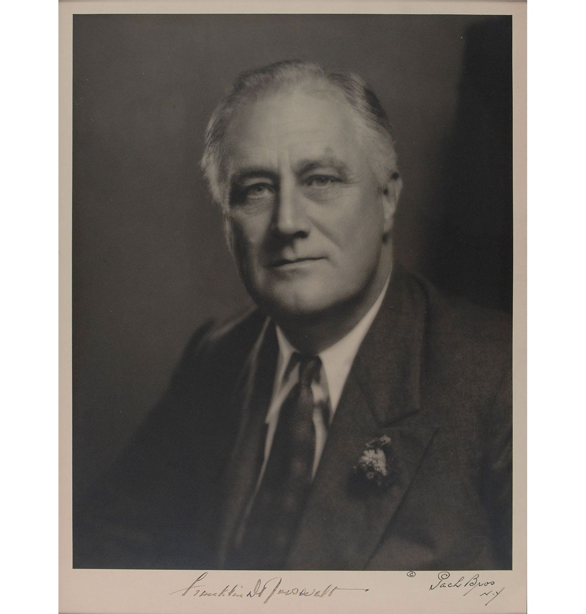 Splendid vintage matte-finish 11.5 x 15 bust-length portrait of Roosevelt by Pach Bros. of New York, signed in the lower border in fountain pen, “Franklin D. Roosevelt.” Archivally cloth-matted and framed to an overall size of 19.75 x 24. In fine condition, with slight irregular adhesion to the signature.