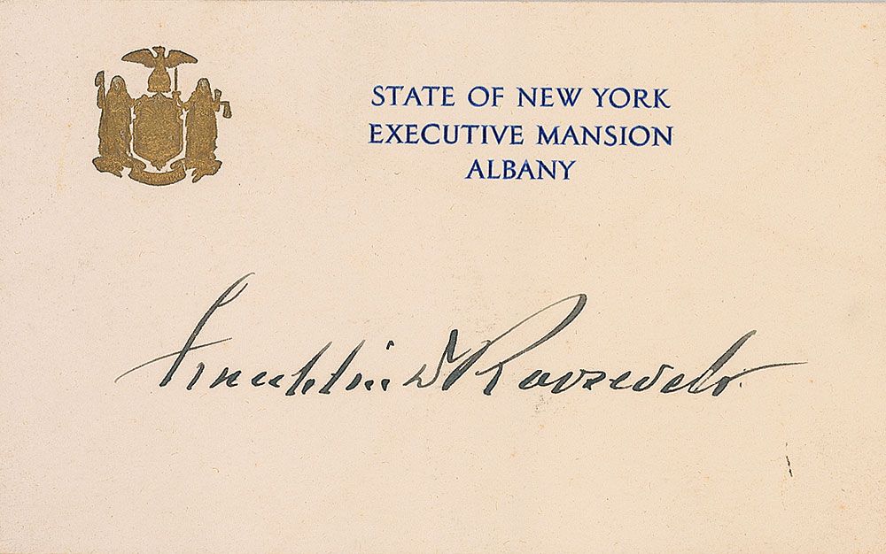 Bold ink signature, “Franklin D. Roosevelt,” on an off-white 5 x 3 embossed State of New York Executive Mansion card. In fine condition.