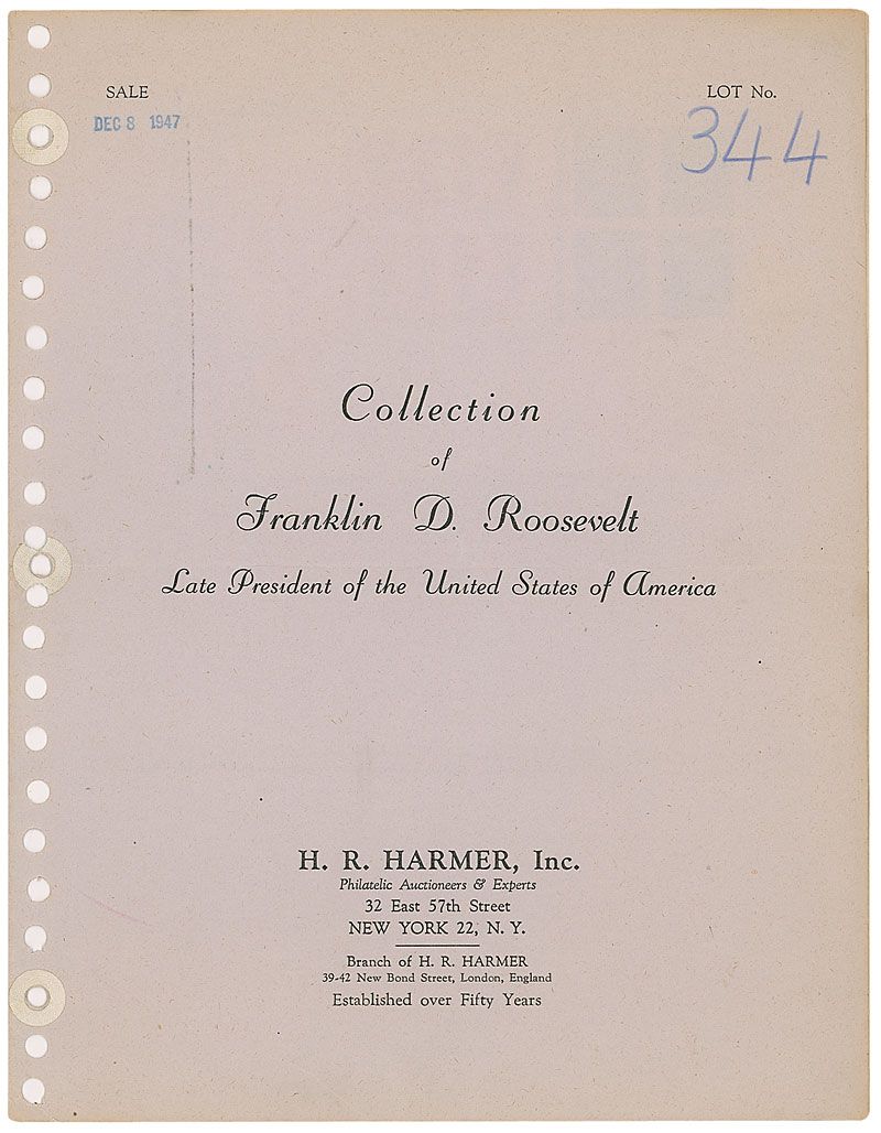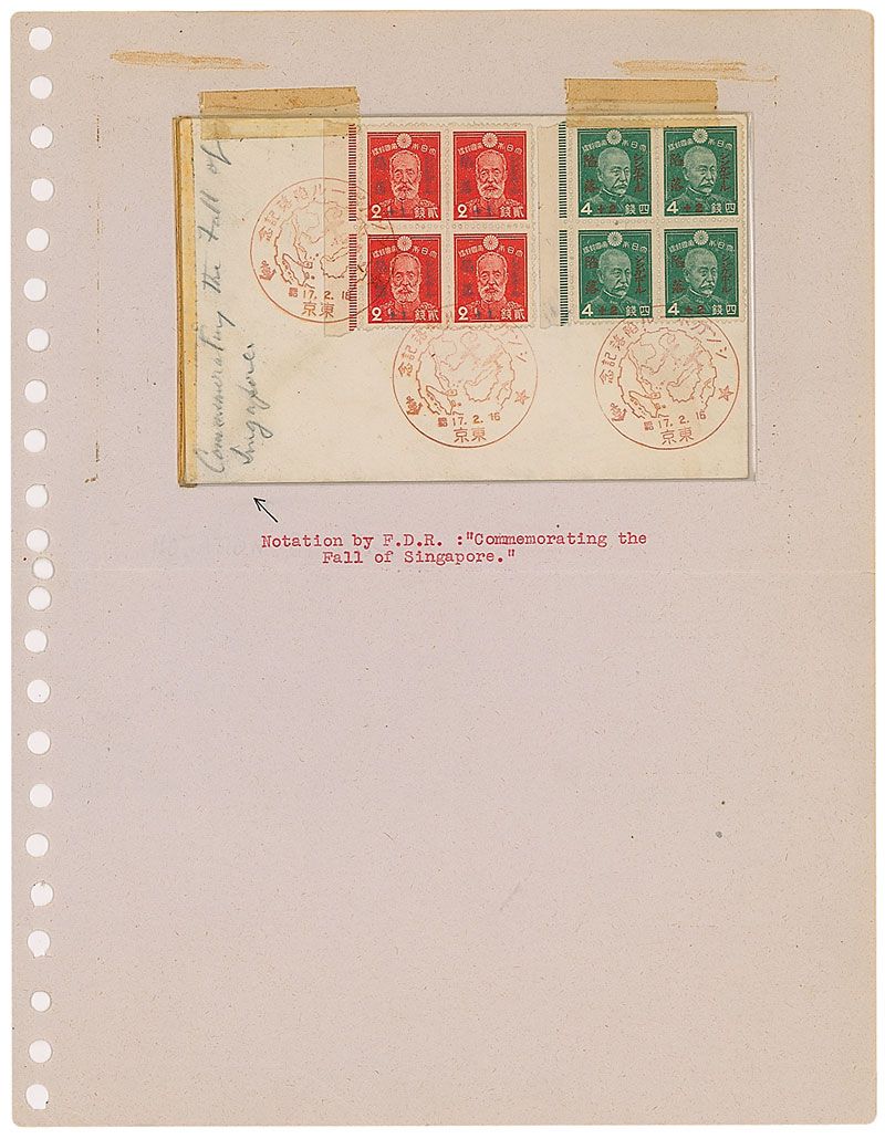 Pencil notation written vertically along the left edge of a 5.5 x 3.5 mailing envelope, bearing three Singapore postmarks of February 17, 1916. Roosevelt writes, “Commemorating the fall of Singapore.” Envelope originates from Roosevelt’s personal collection and is still housed in its original H. R. Harmer, Inc., auction folder, held on December 8, 1947. In fine condition.