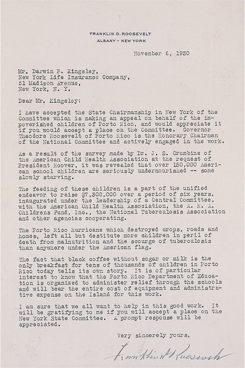 TLS, one page, 7.25 x 10.5, personal letterhead, November 6, 1930. Letter to Darwin P. Kingsley, president of New York Life. In part: “I have accepted the State Chairmanship in New York of the Committee which is making an appeal on behalf of the impoverished children of Porto [sic] Rico…Governor Theodore Roosevelt of Porto Rico is the Honorary Chairman of the National Committee and actively engaged in the work…as a result of the survey…at the request of President Hoover…over 150,000 American school children are seriously undernourished—some slowly starving…The feeding of these children is a part of the unified endeavor to raise $7,300,000 over a period of six years…The Porto Rico hurricane…destroyed crops, roads and homes, left all but destitute more children in peril of death from malnutrition and the scourge of tuberculosis than anywhere under the American flag…black coffee without sugar or milk is the only breakfast for tens of thousands of children in Porto Rico today tells its own story…I am sure that we all want to help in this good work. It will be gratifying to me if you will accept a place on the New York State Committee.” In fine condition, with a tack hole to the upper border. Accompanied by a TLS to Kingsley from FDR’s friend, W. H. Woodin, regarding an unrelated fundraising campaign.