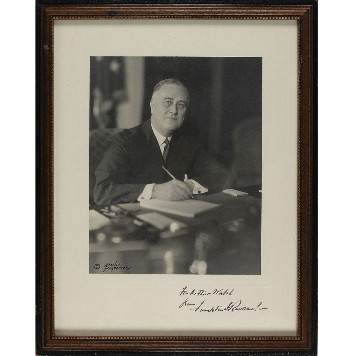 Vintage matte-finish 10 x 13.25 Hessler/Henderson photo of Roosevelt at his desk, signed and inscribed in the lower border in fountain pen, “For Arthur Walsh from Franklin D. Roosevelt.” Framed to an overall size of 11.75 x 15. In fine condition. Arthur Walsh (1896-1947) began his career as a recording violinist for Thomas A. Edison in 1915 and later held executive positions with the Edison Enterprises. A presidential elector for FDR in 1940, Walsh was appointed on November 26, 1943, to represent New Jersey in the US Senate to fill the vacancy left by the death of W. Warren Barbour. He served until December 7, 1944, when a duly elected successor qualified.