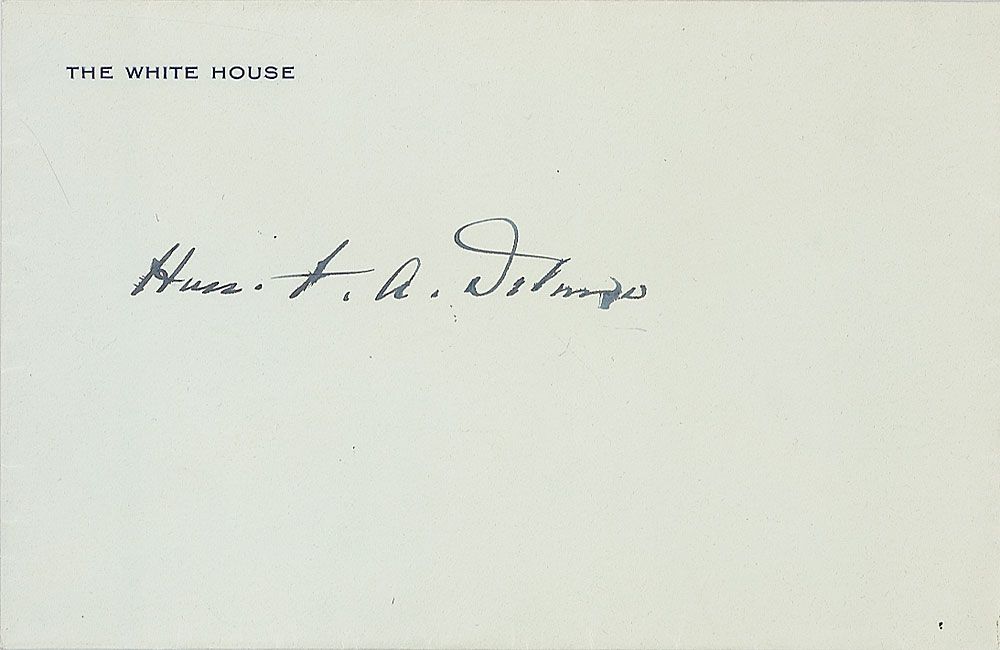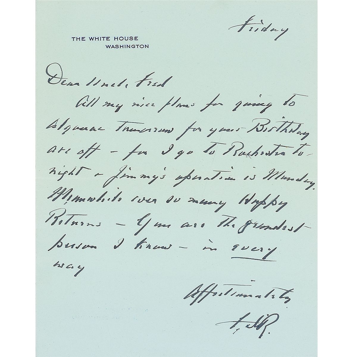 Rare ALS as president signed “F. D. R.,” one page, 7 x 9, White House letterhead, no date [circa September, 1938]. Letter to Frederic Delano, his mother’s brother, addressed as “Dear Uncle Fred.” In full: “All my nice plans for going to Algonac tomorrow for your Birthday are off—for I go to Rochester to night & Jimmy’s operation is Monday. Meanwhile ever so many Happy Returns—You are the grandest person I know—in every way.” In fine condition. Accompanied by the original White House transmittal envelope addressed by Roosevelt to “Hon. F. A. Delano.” As Hitler set his sights on the Sudetenland, escalating the situation abroad, the US president faced his own struggles at home. After previously unsuccessful treatments for a small gastric ulcer, Roosevelt’s son James was scheduled for emergency surgery on September 12th. Canceling plans to attend his “Dear Uncle Fred’s” 75th birthday celebration at the Delano family estate in Algonac, he offers his warmest wishes for “ever so many Happy Returns.” A kind, sincere, and decidedly rare handwritten letter from the president, setting aside his private worries and international concerns.