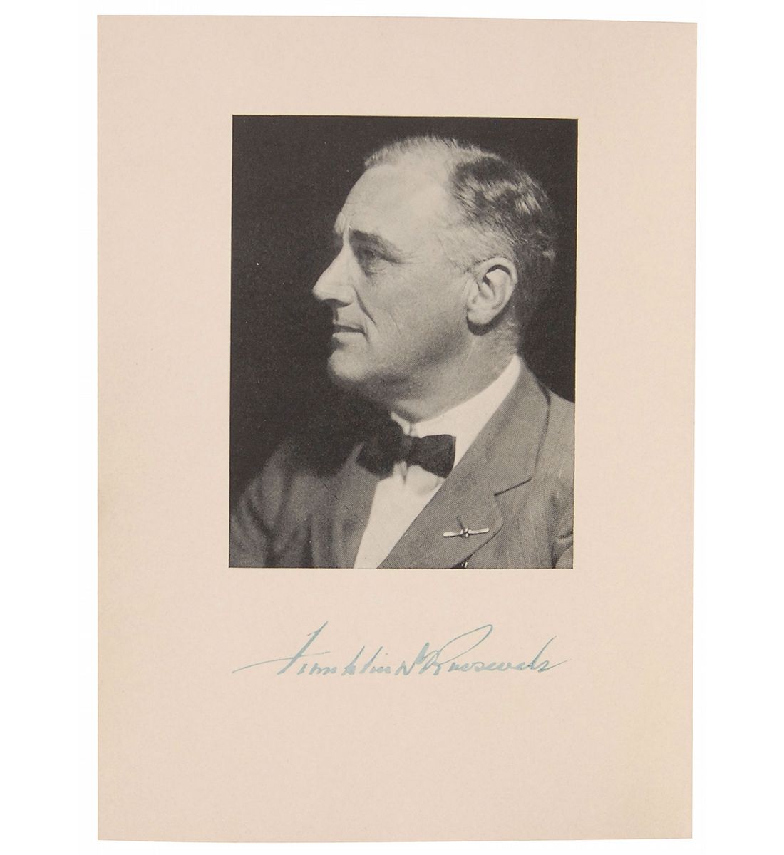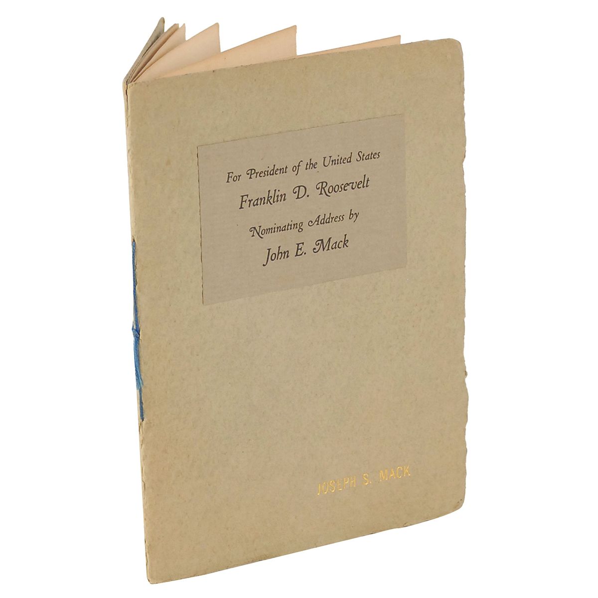 Gorgeous and highly desirable booklet containing the address given by Joseph S. Mack at the 1932 Democratic National Convention in Chicago to nominate FDR as the party’s presidential candidate, 4.75 x 6.25, 15 pages, signed below the frontispiece portrait in fountain pen, “Franklin D. Roosevelt.” Also signed by Mack below his portrait on the following page. This attractively prepared presentation copy is gilt-stamped on the front cover, “Joseph S. Mack,” presumably as a gift to one of John Mack’s relatives. In fine condition, with a Jefferson postage stamp and toned piece of tape affixed to the page signed by Mack. Although Roosevelt’s widespread national popularity would go on to earn him a remarkable four presidential election victories, the vote at the 1932 DNC was closely contested—two other candidates, Al Smith and John Nance Garner, were thoroughly considered, and it took four rounds of ballots for a two-thirds majority to agree on FDR as the nominee. This beautifully made, immensely rare booklet marks the beginning of Roosevelt’s road to the presidency, where he became one of America’s most beloved leaders.