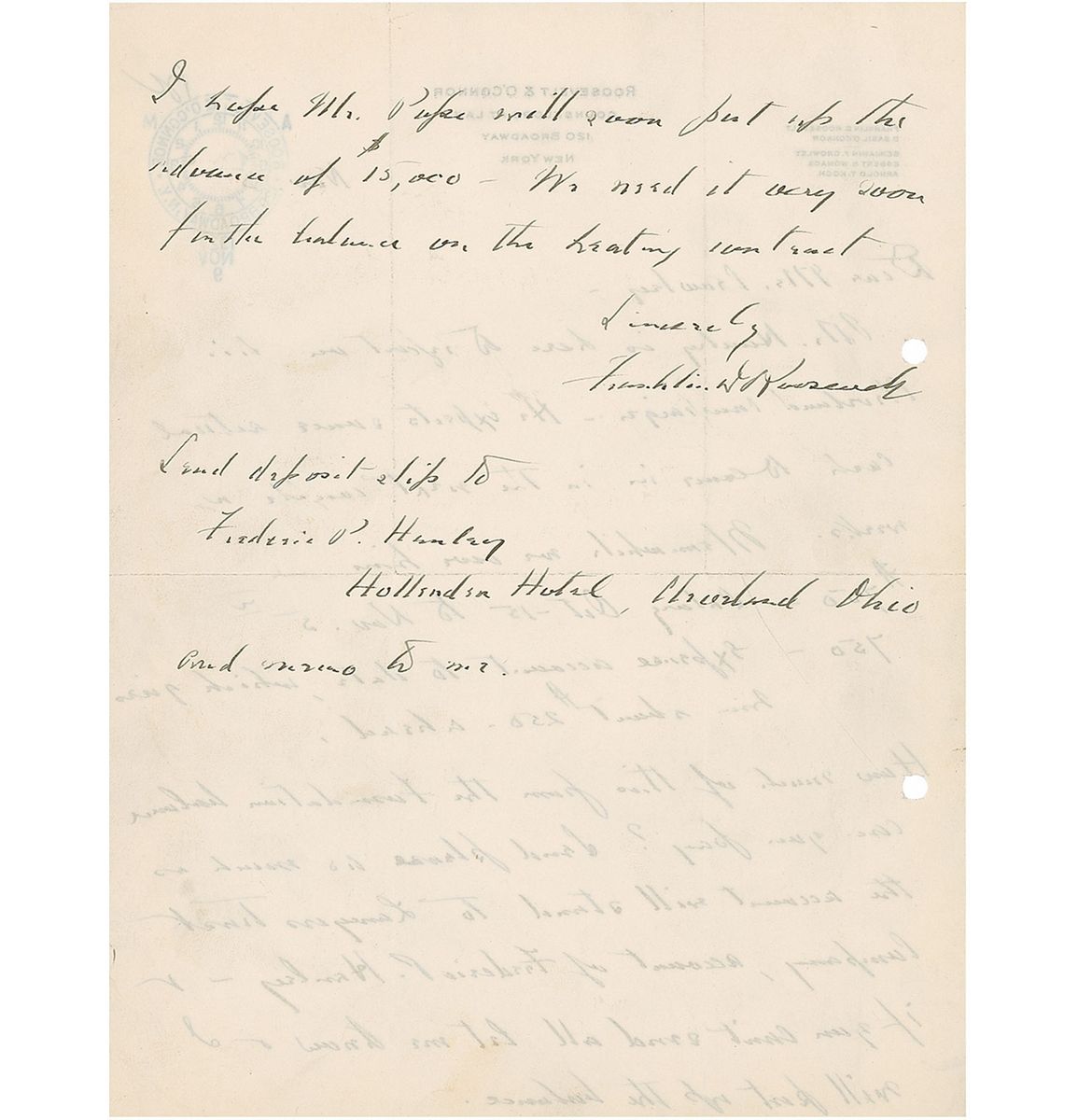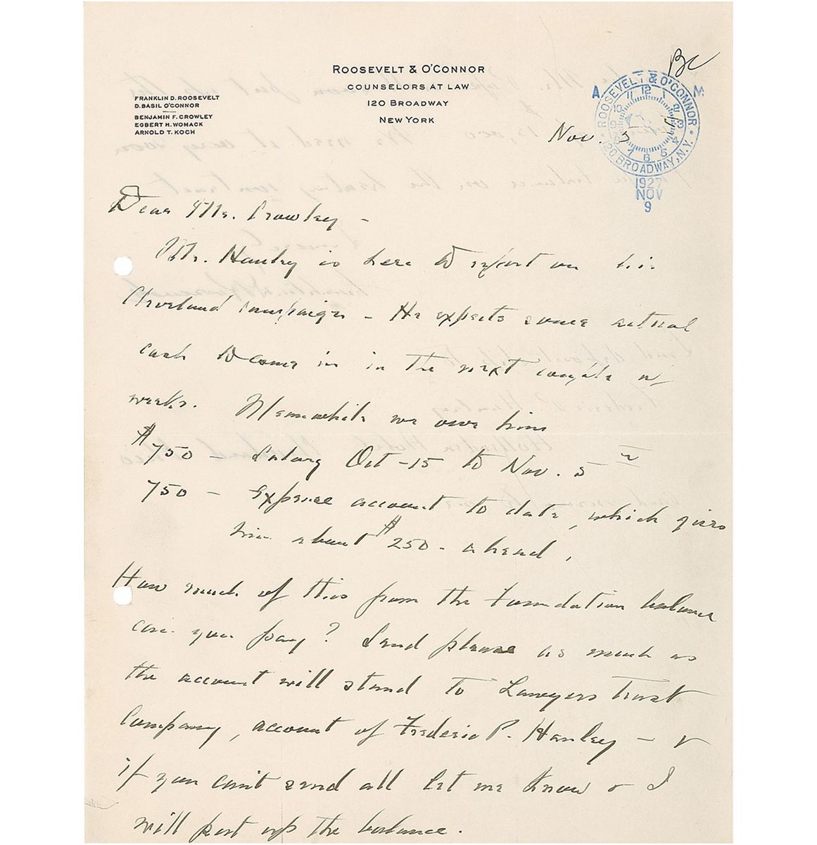 ALS, one page both sides, 8.5 x 11, Roosevelt and O’Connor letterhead, November 5, 1927. Letter to an office worker. In part: “Mr. Hanley is here to report on his Cleveland campaign. He expects some actual cash to come in in the next couple of weeks. Meanwhile we owe him $750—salary…750 expense account to date, which gives him about $250 ahead. How much of this from the Foundation balance can we pay? Send please as much as the account will stand to Langers Trust Company, account of Frederic P. Hanley—If you can’t send all let me know & I will put up the balance. I hope the Mr. Pope will soon put up the balance of $15,000—We need it very soon for the balance on the heating contract.” In fine condition, with two punch holes to left edge, and intersecting mailing folds, one through a single letter of signature.