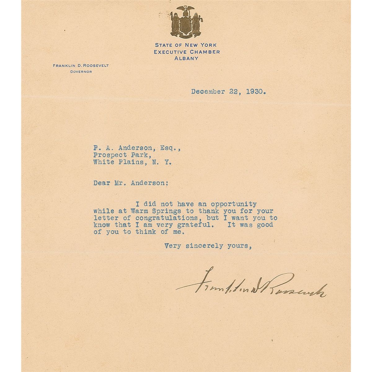TLS, one page, 8 x 9, State of New York Executive Chamber letterhead, December 22, 1930. Letter to P. A. Anderson. In full: “I did not have an opportunity while at Warm Springs to thank you for your letter of congratulations, but I want you to know that I am very grateful. It was good of you to think of me.” Uniform toning and a trimmed bottom edge, otherwise fine condition. In 1924, FDR famously traveled to Warm Springs, Georgia, where he found that immersion in the area’s mineral-rich warm water was one of the few things that provided relief from his polio-induced paralysis. Shortly thereafter he purchased the resort and developed it into what became a world-famous polio treatment center—the Georgia Warm Springs Foundation, still in operation today as the Roosevelt Warm Springs Institute for Rehabilitation. An important association.