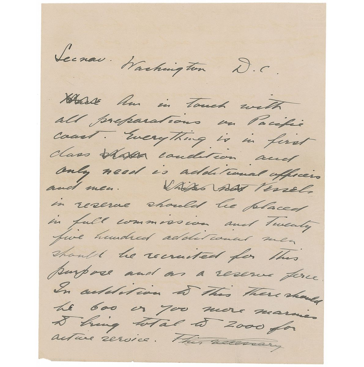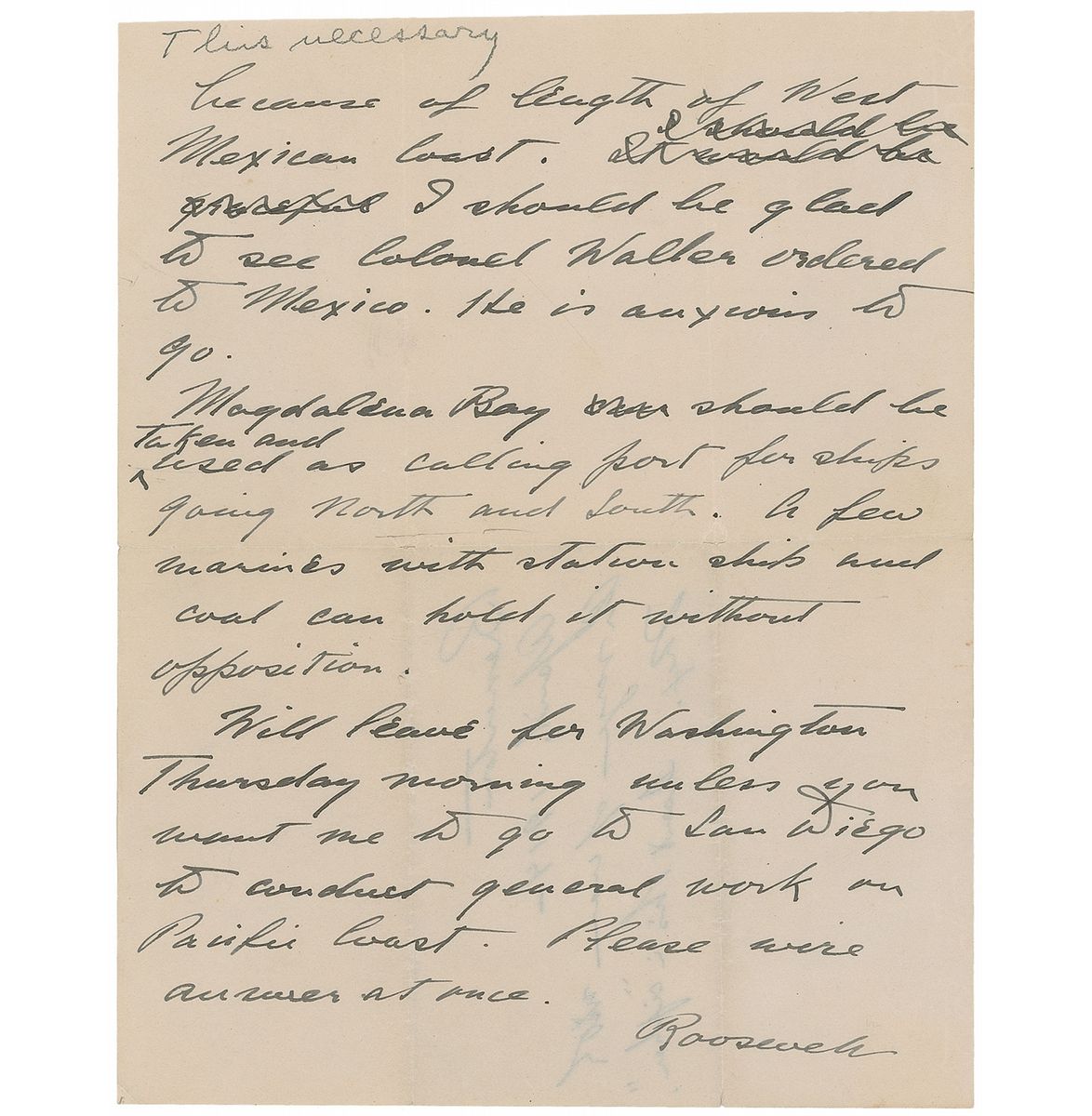 ALS signed “Roosevelt,” two pages, 8 x 10, no date but April 21, 1914. Draft of a letter to Secretary of the Navy Josephus Daniels. In full: “Am in touch with all preparations on Pacific coast. Everything is in first class shape condition and only need is additional officers and men. Ships not Vessels in reserve should be placed in full commission and twenty five hundred additional men should be recruited for this purpose as a reserve force. In addition to this there should be 600 or 700 more marines to bring total to 2000 for active service. This necessary because of length of West Mexican Coast. I would be grateful I should be I should be glad to see Colonel Waller ordered to Mexico. He is anxious to go. Magdalena Bay can should be taken and used as calling port for ships going North and South. A few marines with station ship and coal can hold it without opposition. Will leave for Washington Thursday morning unless you want me to go to San Diego to conduct general work on Pacific Coast. Please wire answer at once.” A pencil notation in another hand to the reverse of the second page reads: “Bremerton, April, 1914—On verge of war with Mex. I sent this in ‘cipher.’” In fine condition, with intersecting folds.