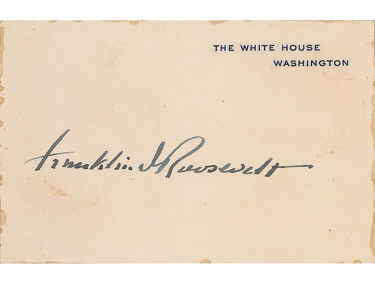 White House card, boldly signed in fountain pen, “Franklin D. Roosevelt.” In very good condition, with some scattered light toning and soiling to front of card, and heavy mounting and adhesive remnants to reverse.