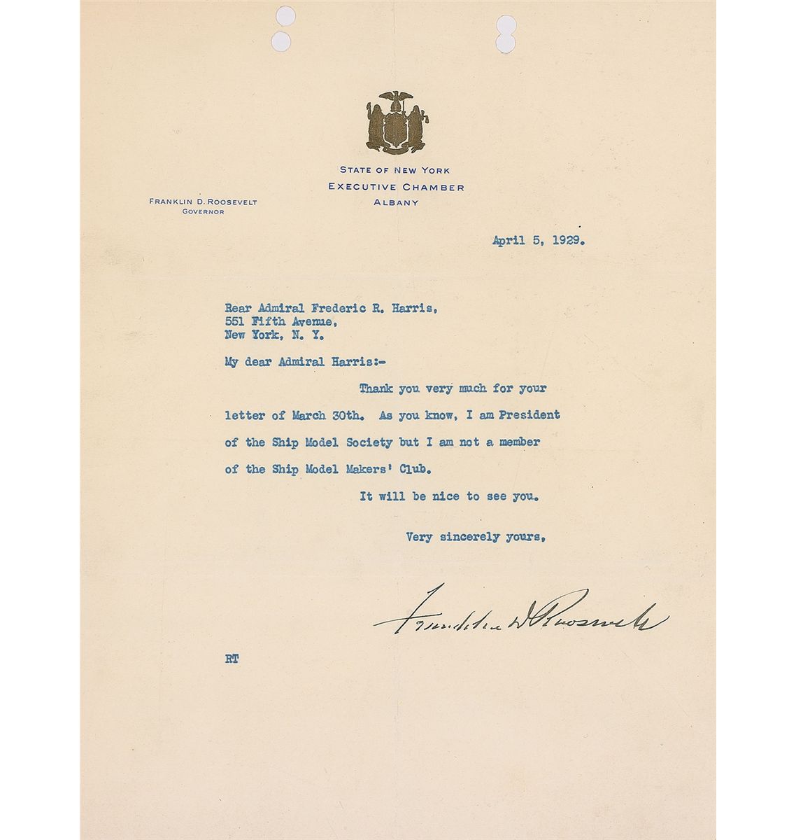 TLS, one page, 8 x 10.5, State of New York Executive Chamber letterhead, April 5, 1929. Letter to Rear Admiral Frederic Harris. In full: “Thank you very much for your letter of March 30th. As you know, I am President of the Ship Model Society but I am not a member of the Ship Model Maker’s Club. It will be nice to see you.” In fine condition, with intersecting folds (one touching first letter of signature), and paperclip impressions and punch holes to top edge.