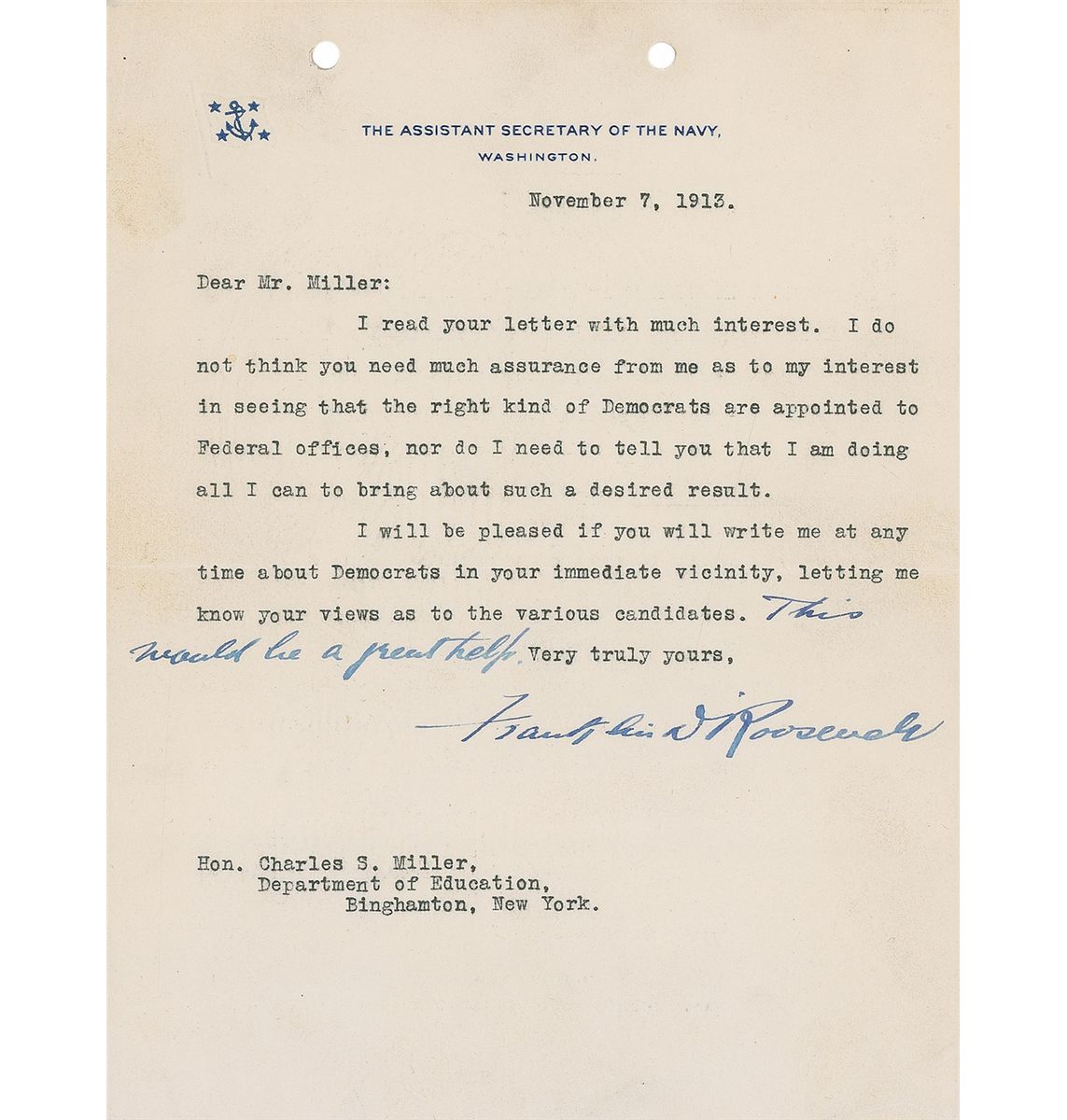 Early TLS, one page, 7 x 25, Assistant Secretary of the Navy letterhead, November 7, 1913. Letter to Charles S. Miller of New York’s Department of Education. In part: “I do not think you need much assurance from me as to my interest in seeing that the right kind of Democrats are appointed to Federal offices, nor do I need to tell you that I am doing all I can to bring about such a desired result. I will be pleased if you will write me at any time about Democrats in your immediate vicinity, letting me know your views as to the various candidates.” In a handwritten addendum, Roosevelt adds, “This would be a great help.” In fine condition, with light soiling and filing holes to the top. A fine example of FDR exercising his political might early on in his career—he had just entered politics in 1910 with an unexpected win in the election for a seat in the New York State Senate. Democratic politics in New York were still dominated by the bossism of Tammany Hall, and Roosevelt became the leader of the party’s ‘insurgent’ faction fighting against the deep-rooted machine. His assurance of supporting “the right kind of Democrats” almost certainly refers to this intraparty battle between the old, corrupt Tammany Democrats ingrained in New York politics and the emerging new liberals that Roosevelt represented.