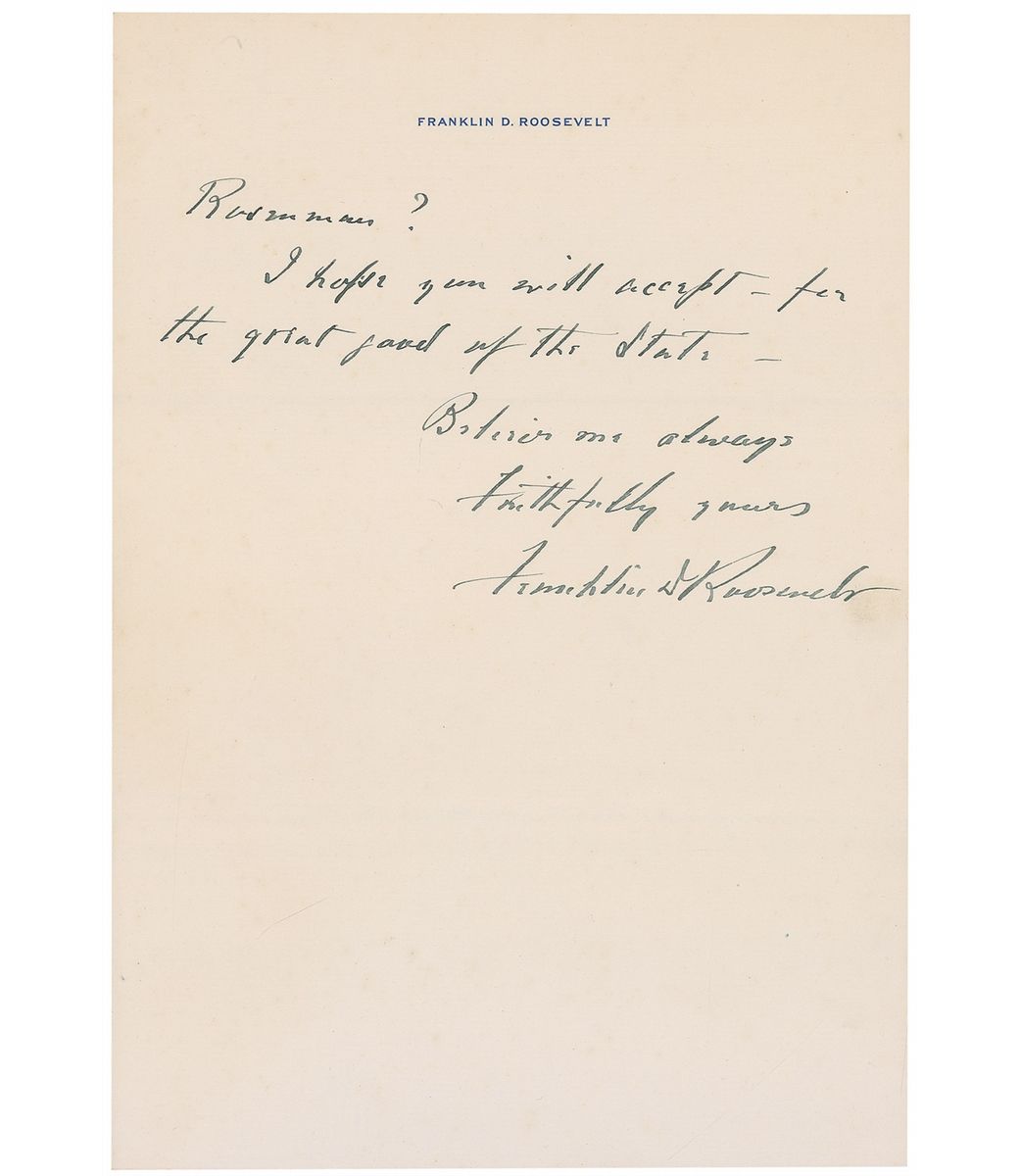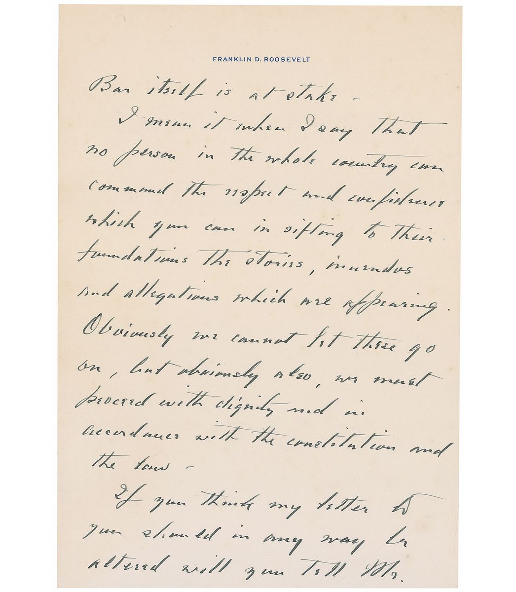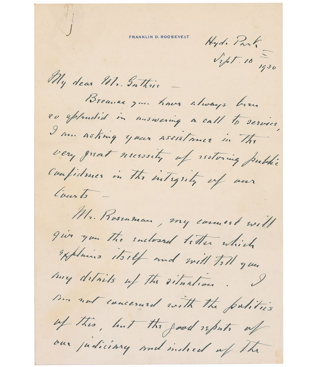ALS, three pages, 7.25 x 10.5, personal letterhead, September 10, 1930. Letter to William D. Guthrie. In full: “Because you have always been so splendid in answering a call to service I am asking your assistance in the very great necessity of restoring public confidence in the integrity of our Courts—Mr. Rosenman, my counsel will give you the enclosed letter which explains itself and will tell you any details of the situation. I am not concerned with the politics of this, but the good reports of our judiciary and indeed of the Bar itself is at stake—I mean it when I say that no person in the whole country can command the respect and confidence which you can in sifting to their foundations the stories, innuendoes and allegations which are appearing. Obviously we cannot let these go on, but obviously also, we must proceed with dignity and in accordance with the constitution and the law—If you think my letter to you should in any way be altered will you tell Mr. Rosenman? I hope you will accept—for the great good of the State.” In fine condition, with a rusty paperclip impression to the upper left. Accompanied by Guthrie’s retained carbon copies of his response, declining the request. Roosevelt had become governor in 1929, inheriting what was left of the corrupt Tammany Hall political machine that had pervaded state politics for decades. This letter must have been spurred by the disappearance of Joseph Force Crater, an associate justice of the New York Supreme Court, who had gone missing in early August. No alarm was raised—he had said he was going on a trip—until August 25, when he failed to appear for the opening of the courts, but the police were not notified until September 3. The case immediately became front-page news and received widespread publicity, but no trace of Force was ever found. The suspicious circumstances of the vanished judge added to public disquiet about corruption in city government—and as FDR points out here, undermined the integrity of the state’s legal system.