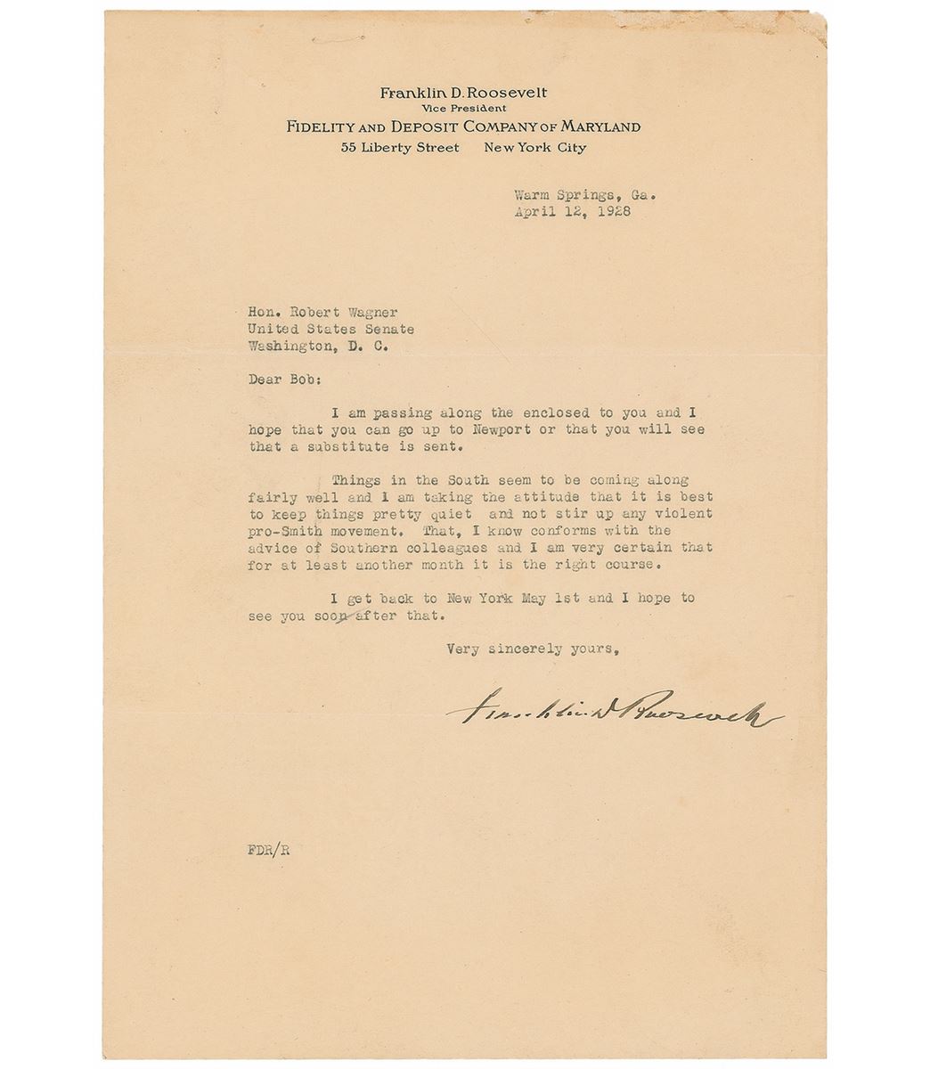 TLS, one page, 7.25 x 10.5, Fidelity and Deposit Company of Maryland letterhead, April 12, 1928. Letter to then-Senator of New York Robert Wagner, in part: “Things in the South seem to be coming along fairly well and I am taking the attitude that it is best to keep things pretty quiet and not stir up any violent pro–Smith movement. That, I know conforms with the advice of Southern colleagues and I am very certain that for at least another month it is the right course. I get back to New York May 1st and I hope to see you soon after that.” In fine condition, with staples holes and some surface loss along top edge, and horizontal mailing fold passing through portions of the signature. On the referral of presidential candidate and former New York Governor Al Smith, Roosevelt joined the democratic ticket in the 1928 New York state election and defeated Albert Ottinger in the race for governor.