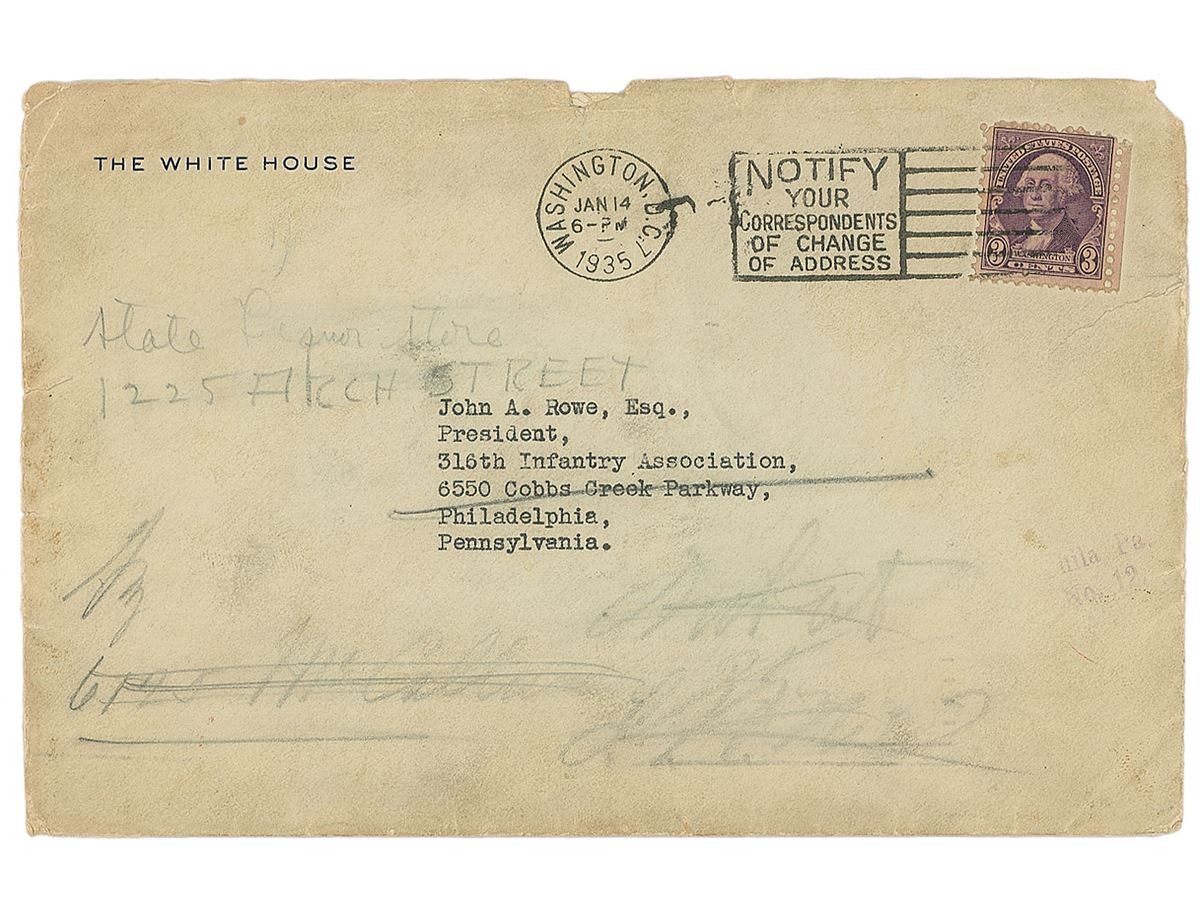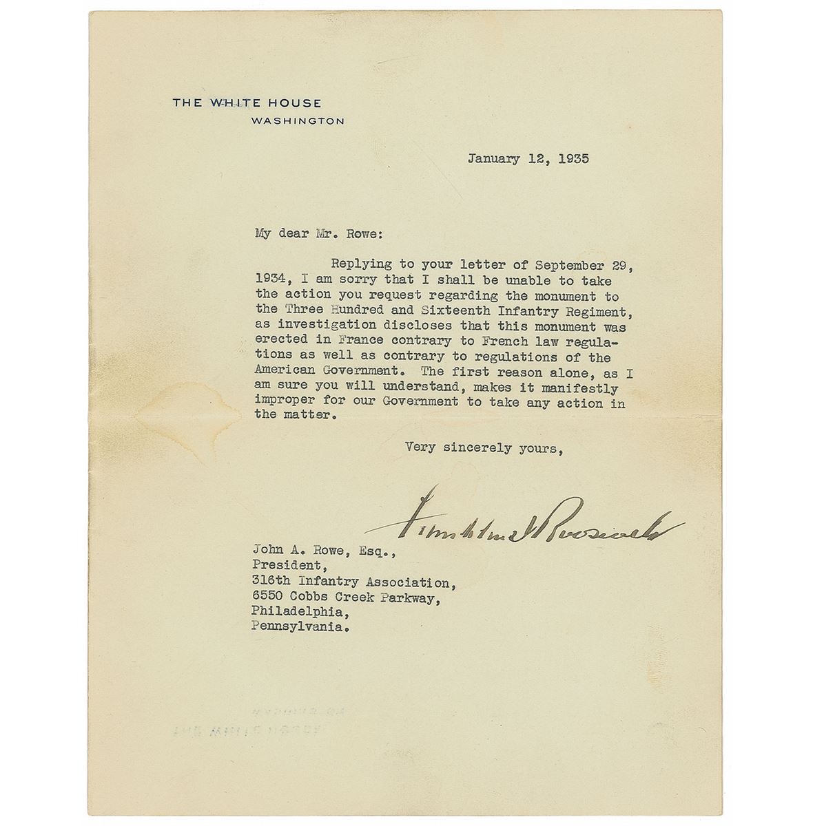 TLS, one page, 7 x 8.75, White House letterhead, January 12, 1935. Letter to John Rowe, in part: “I am sorry that I shall be unable to take the action you request regarding the monument to the Three Hundred and Sixteenth Infantry Regiment, as investigation discloses that this monument was erected in France contrary to regulations of the American Government. The first reason alone, as I am sure you will understand, makes it manifestly improper for our Government to take any action in the matter.” A partial separation to right edge of mailing fold, faint mirroring of the letterhead, slight toning and creasing, and a spot of dampstaining to left side, otherwise fine condition. Accompanied by the original mailing envelope. As the Meuse-Argonna offensive continued its Western Front march in the waning days of World War I, the 316th infantry successfully recovered Hill #378 from German forces after three days of heavy combat in the Lorraine region of France. Initially deemed as ‘The Crusaders of Lorraine’ for their courageous actions, the self-aggrandizing erection of a monument symbolizing their own achievement proved objectionable to the French government.