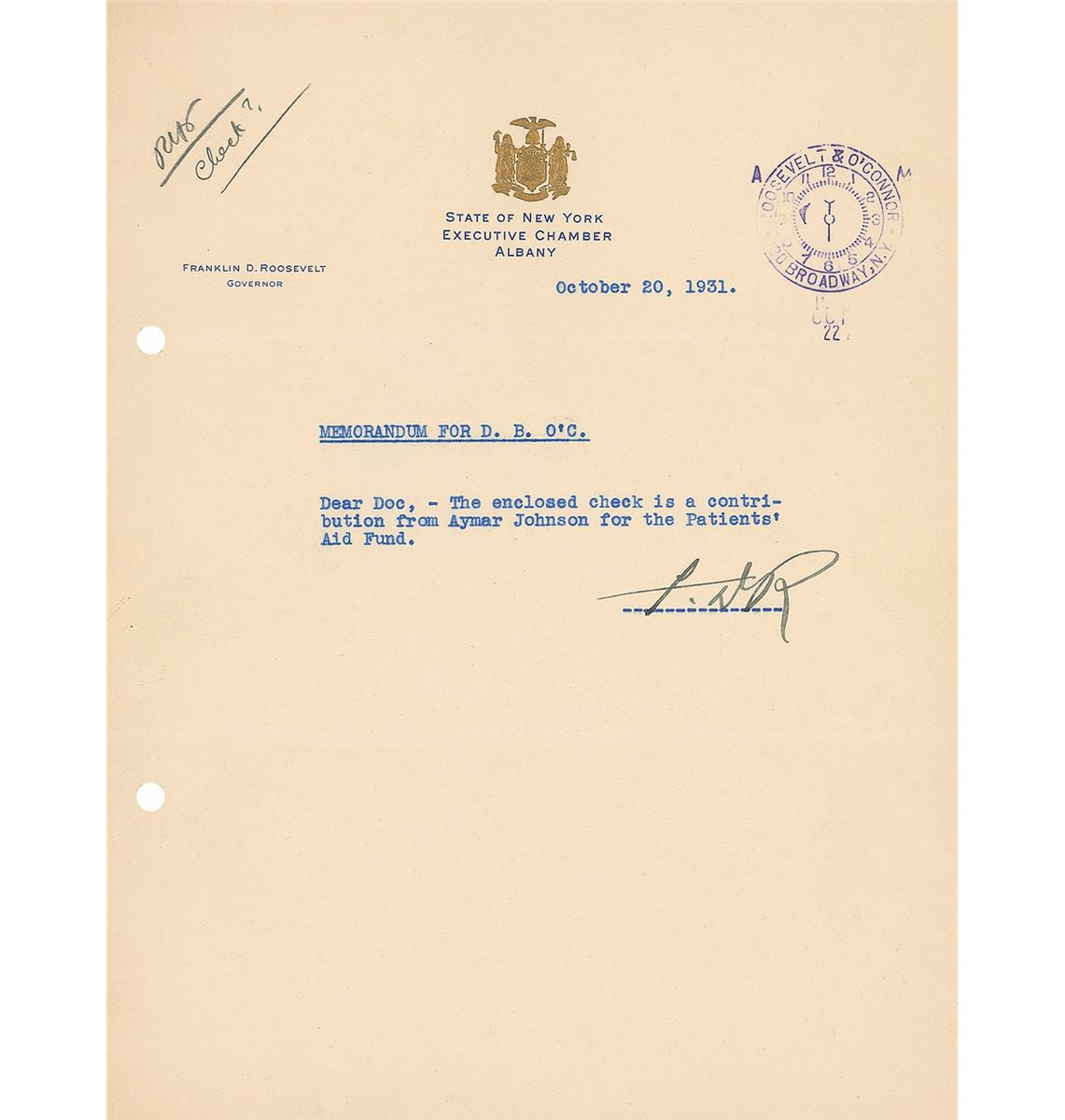 Typed memorandum signed “FDR,” one page, 8 x 10.5, embossed State of New York Executive Chamber letterhead, October 20, 1931. Memo to his close friend “D. B. O’C,” the philanthropist Basil O’Connor. In full: “Dear Doc,—The enclosed check is a contribution from Aymar Johnson for the Patients’ Aid Fund.” In fine condition, with expected document wear and filing holes to the left edge. In 1927, Roosevelt partnered with O’Connor to develop the Georgia Warm Springs Foundation, a world-famous polio treatment center.