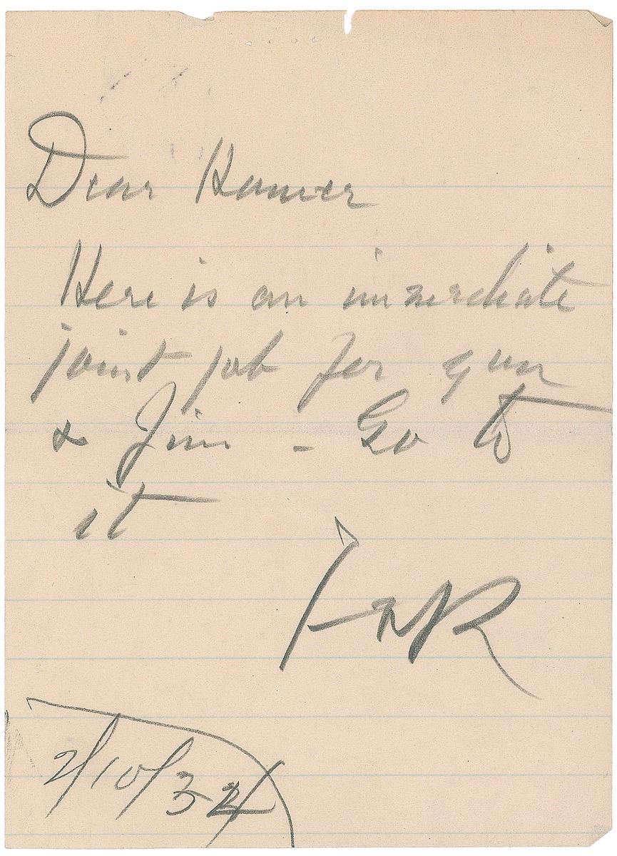 ANS in pencil, signed “FDR,” one page, 4 x 5.5, February 10, 1934. In full: “Here is an immediate joint job for you & Jim—Go to it.” In very good condition, with moderate scattered creases and a paperclip impression and pinholes to the top edge.