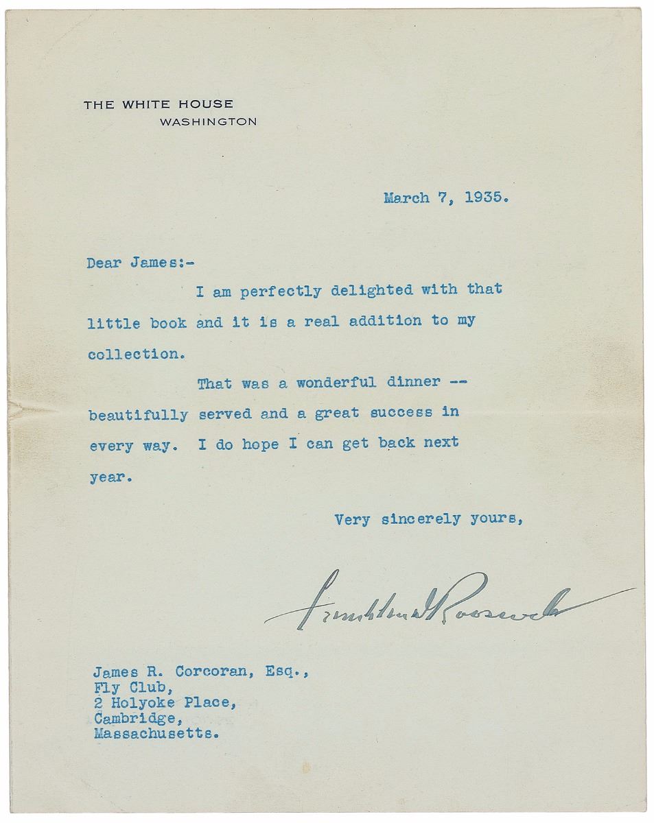 TLS as president, one page, 7 x 8.75, White House letterhead, March 7, 1935. Letter to James R. Corcoran of the Fly Club, in full: “I am perfectly delighted with that little book and it is a real addition to my collection. That was a wonderful dinner—beautifully served and a great success in every way. I do hope I can get back next year.” In fine condition, with slight soiling and creasing. Founded in 1836, the Fly Club is an undergraduate social group at Harvard University, and Roosevelt, as a former student member of the society, attended many of its annual dinners.
