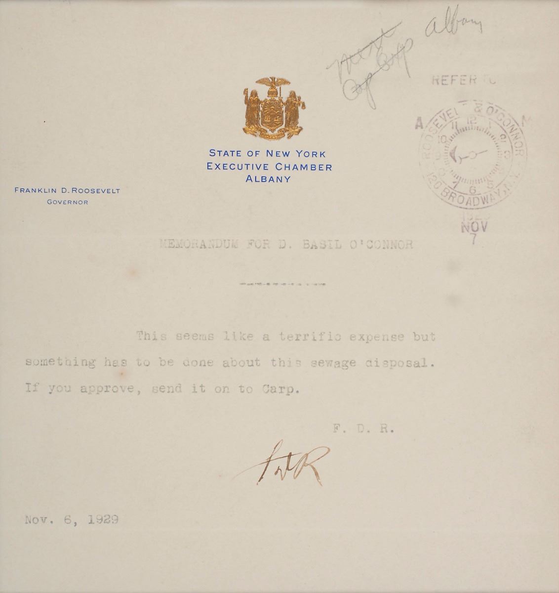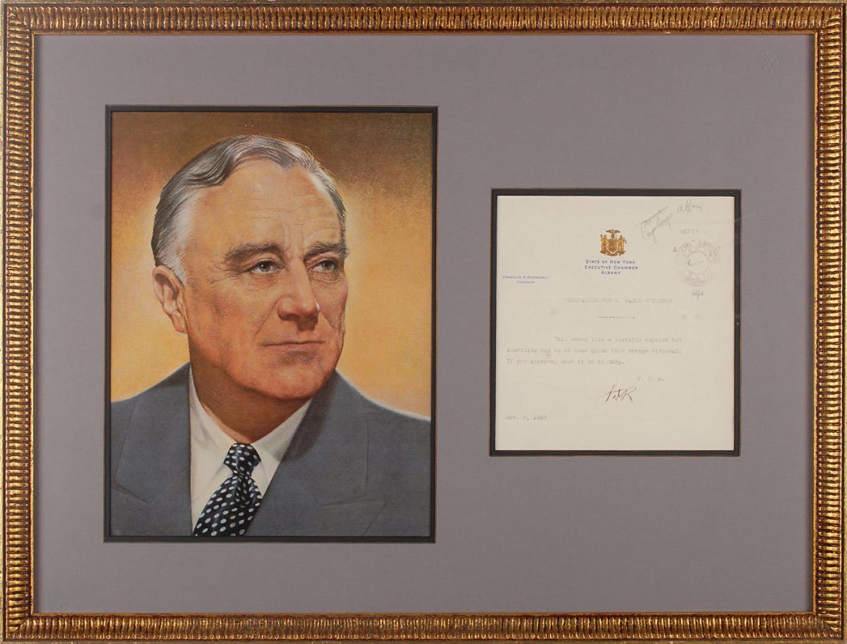 Typed memorandum signed “FDR,” one page, 7 x 7.5, embossed State of New York Executive Chamber letterhead, November 6, 1929. Memo to his close friend, the philanthropist Basil O’Connor. In full: “This seems like a terrific expense but something has to be done about this sewage disposal. If you approve, send it on to Carp.” Double-matted and framed with a large color portrait of Roosevelt to an overall size of 25 x 19. In fine condition, with expected document wear. In 1927, Roosevelt partnered with O’Connor to develop the Georgia Warm Springs Foundation, a world-famous polio treatment center.
