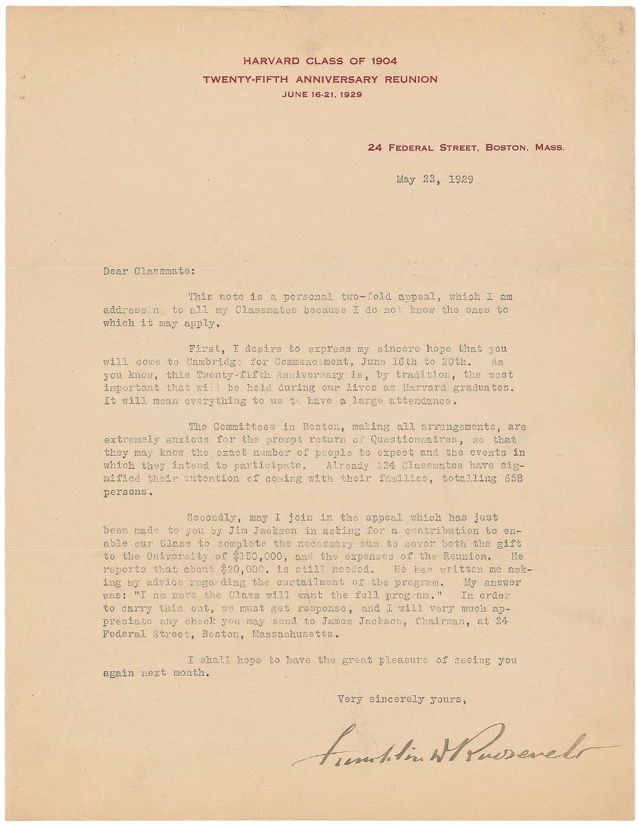 TLS, one page, 8.5 x 11, Harvard Class of 1904, Twenty-fifth Anniversary Reunion letterhead, May 23, 1929. Letter to a classmate, in part: “First, I desire to express my sincere hope that you will come to Cambridge for Commencement, June 16th to 20th. As you know, this Twenty-fifth Anniversary is, by tradition, the most important that will be held during our lives as Harvard graduates. It will mean everything to us to have a large attendance…Secondly, may I join in the appeal which has just been made to you by Jim Jackson in asking for a contribution to enable our Class to complete the necessary sum to cover both the gift to the University of $150,000, and the expenses of the Reunion. He reports that about $20,000. is still needed. He has written me asking my advice regarding the curtailment of the program. My answer was: ‘I am sure the Class will want the full program.’” In fine condition, with trivial creasing and soiling, and a small tear to top edge.