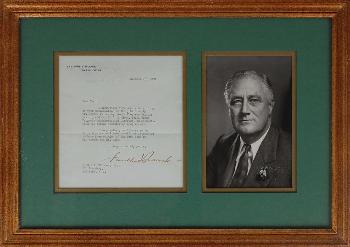 TLS as president, one page, 6.5 x 7, White House letterhead, November 18, 1938. Letter to Basil O’ Connor, in full: “I appreciate very much your writing me your recommendation of the jobs done by Mr. Lester W. Herzog, Works Progress Administrator, and Mr. H. P. C. Howe, local Works Progress Administration Director, in connection with the recent disaster on Long Island. I am passing your letters on to Harry Hopkins as I know he will be interested to have your opinion of the work done by Mr. Herzog and Mr. Howe.” Framed with a Pach Brothers portrait of FDR. In fine condition. On September 21, 1938, Long Island was hit by a category three hurricane that would soon become one of the deadliest and most powerful weather events to ever face the Mid-Atlantic coast. Forever known as the Great New England Hurricane, an estimated 682 people lost their lives and over 57,000 homes were either damaged or destroyed.