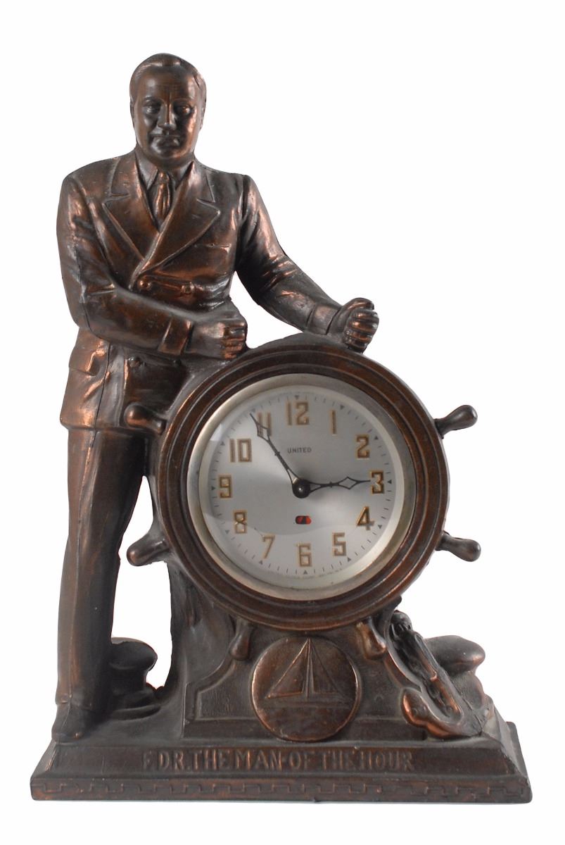 Circa mid-1930s figural clock made by the United Clock Corp., measuring approximately 10 x 15 x 4, portraying Roosevelt valiantly at the helm of the ‘Ship of State,’ with the base reading, “F.D.R. The Man Of The Hour.” In fine condition, with some general marks and rubbing; working condition untested.