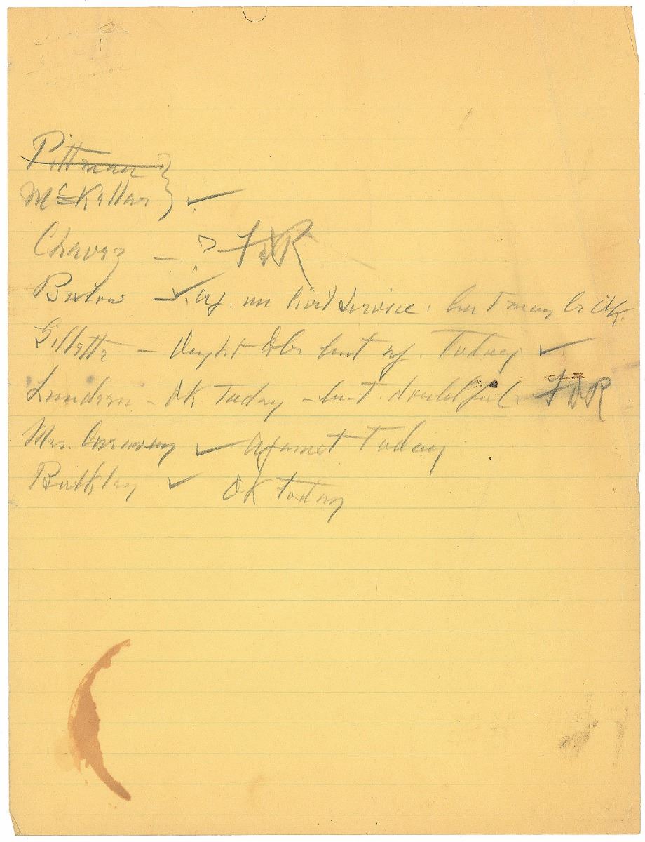Handwritten notes in pencil, initialed twice, “FDR,” one page, 8 x 10.5, no date but circa 1937–1938. A list of senators in the 75th Congress with check marks or notes beside each name, including: “Pittman,” “McKellar,” “Chavez,” “Bulow,” “Gillette,” “Lundeen—OK today, but doubtful,” “Mrs. Caraway—against today,” and “Bulkley—OK today.” In very good condition, with creasing, handling wear, and a coffee cup stain to lower left.